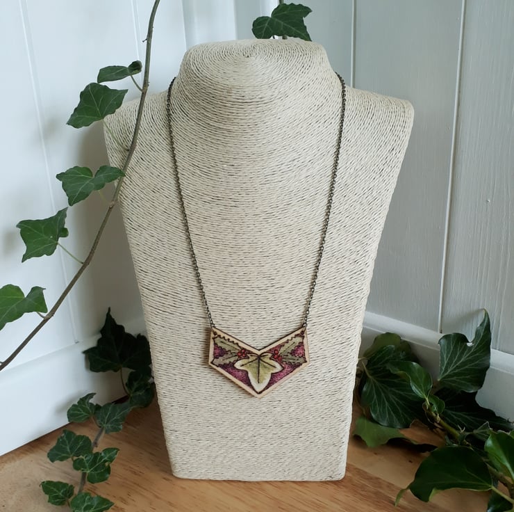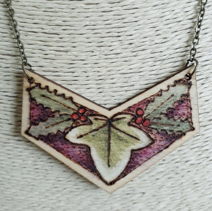 Wooden pendant illustrated with holly & ivy leaves using pyrography (wood burning).
