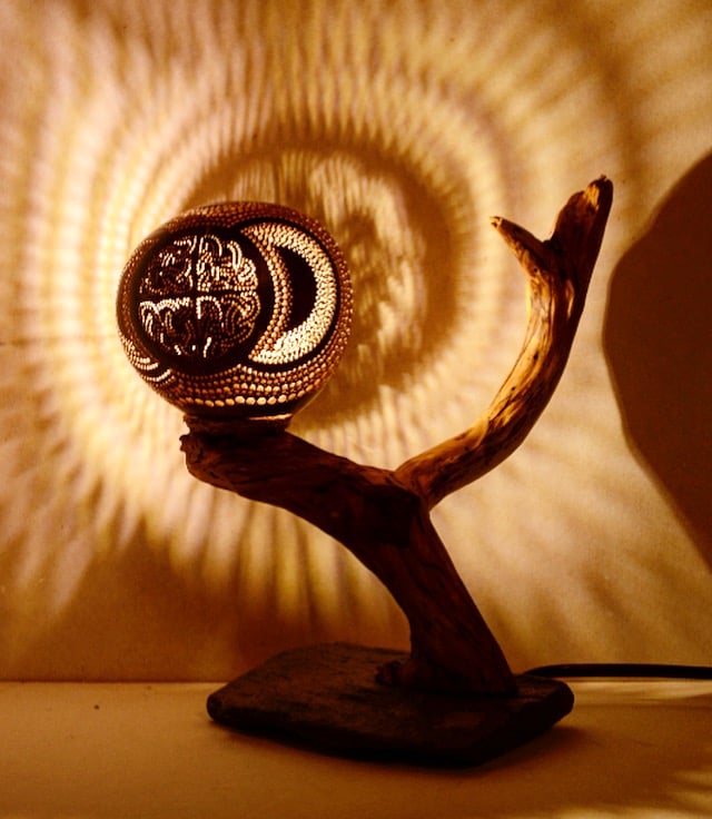 This one of a kind coconut lamp not only lights a space, but transforms the feel of an entire room to create a warm atmosphere by casting beautiful patterns on the wall and ceiling.