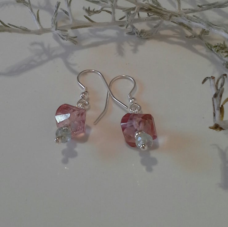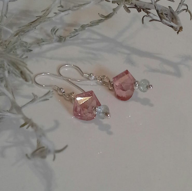 A beautiful unique pair of pink topaz and aquamarine earrings designed and hand crafted using all sterling silver components. The pink topaz have a very unique cut which is only achieved by skilled lapidorists. I was very lucky to obtain a very small strand containing only 12 topaz gemstones. It was considerably expensive, but worth every penny. For those ladies whom know the rare availability of topaz jewellery will appreciate it's value! The aquamarines which complimenting them are faceted rondelle cut.