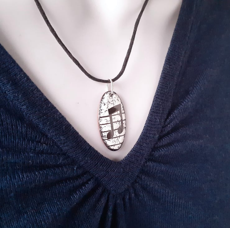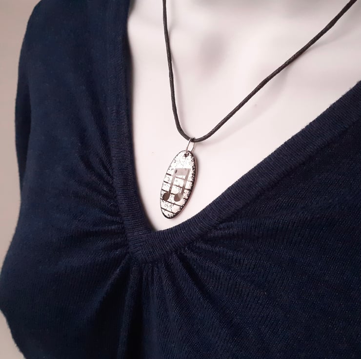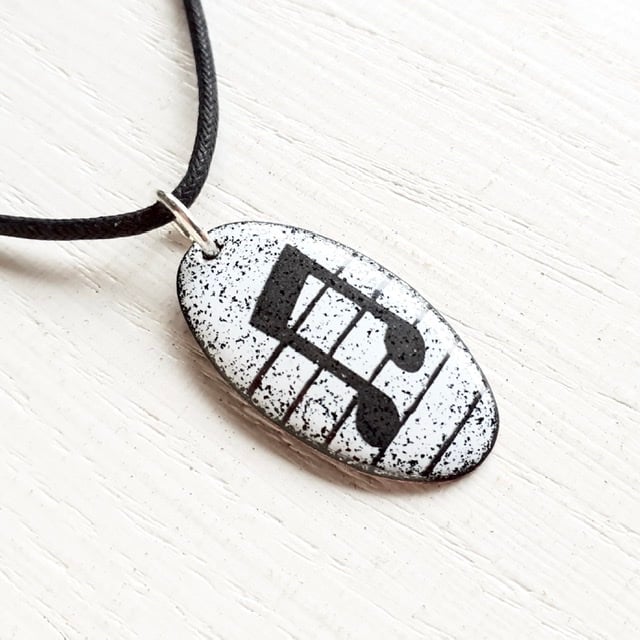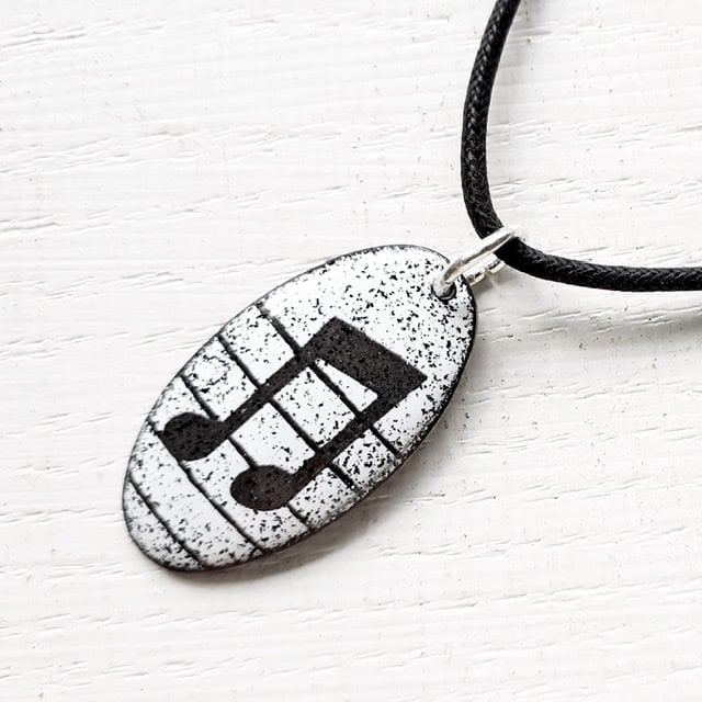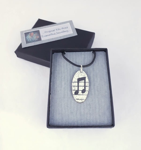 I enamel my Oval Musical Notes Pendant - Semi-Quaver with a bold motif in black & white, it would make a great gift with unisex appeal to friends and family with an interest in music. It measures a little under 3.5 cm by about 18mm and is enamelled on both sides. Each pendant is fired several times, with the quaver motif applied as the final decorative layer. A mixed colour enamel on the reverse adds strength and durability. The pendant is suspended from a black cord with a silver-plated fastener, which I offer in a variety of lengths. Please choose from the options shown. The semi-quaver pendant is presented in a quality card gift box and outer cardboard packaging box and sent by Royal Mail 'Tracked’ postage.