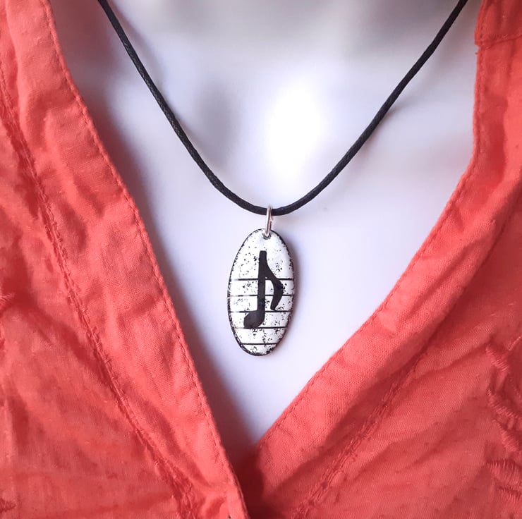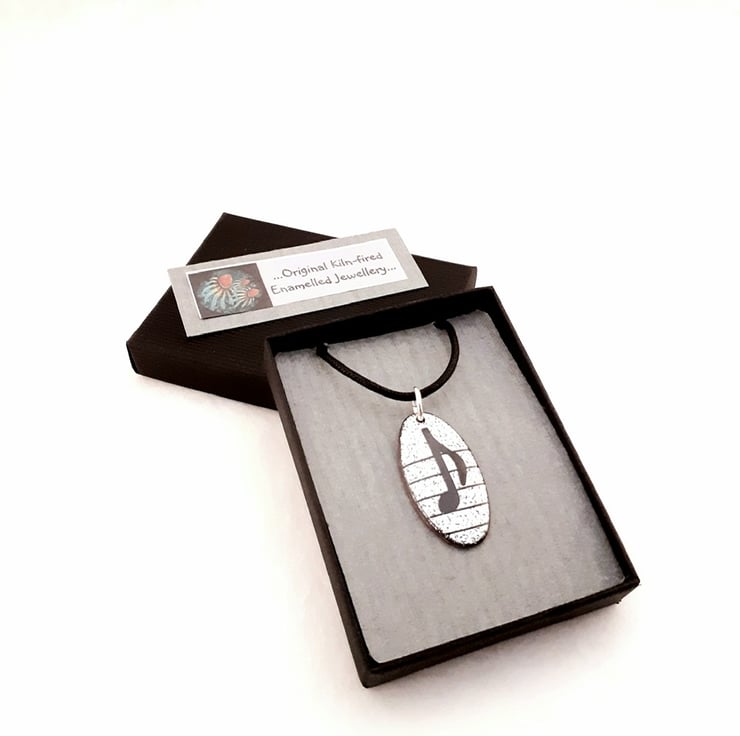 I enamel a bold quaver motif in black & white on this oval pendant which would make a great gift, with unisex appeal it would suit friends and family alike. It measures approximately 3.5cm by about 18mm. The enamelled surface is achieved by applying layers of enamel on both sides of the copper base with firings in between. The quaver motif is applied as the final layer. The reverse has a mixed colour enamel adding strength and durability to this piece of jewellery. The quaver pendant hangs from a black cord, which I offer in a variety of lengths. Please choose from the options given. The pendant is presented in a quality card gift box and sent by Royal Mail 'Signed for’' postage in an outer card packaging box for protection.