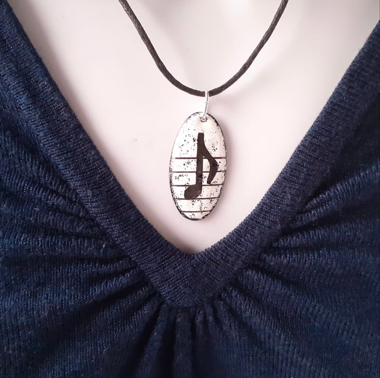 I enamel a bold quaver motif in black & white on this oval pendant which would make a great gift, with unisex appeal it would suit friends and family alike. It measures approximately 3.5cm by about 18mm. The enamelled surface is achieved by applying layers of enamel on both sides of the copper base with firings in between. The quaver motif is applied as the final layer. The reverse has a mixed colour enamel adding strength and durability to this piece of jewellery. The quaver pendant hangs from a black cord, which I offer in a variety of lengths. Please choose from the options given. The pendant is presented in a quality card gift box and sent by Royal Mail 'Signed for’' postage in an outer card packaging box for protection.