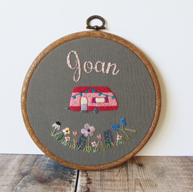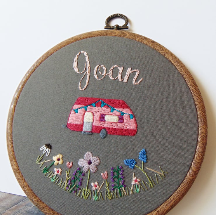 This beautiful caravan themed hoop is the perfect gift for someone who loves spending time in their beloved caravan. These hoops are hand stitched to order, feature a stunning curved flower garden and can be personalised and sewn in any colours. Choose to have any name at the top, any caravan colours and sewn onto lush dark grey fabric. Finally, set in a six inch hoop with ribbon.