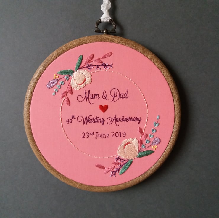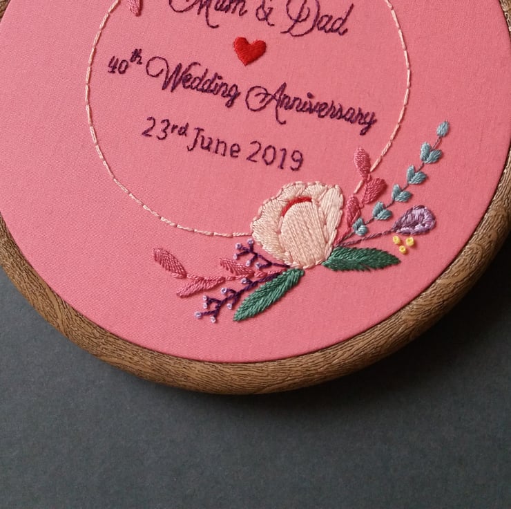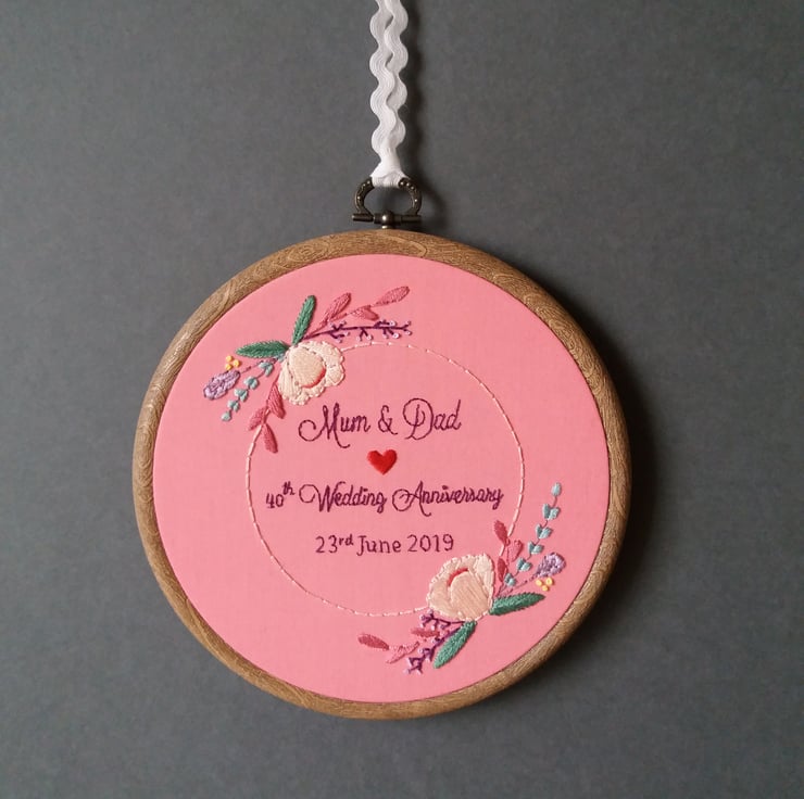 This very special Floral Blush hoop is the perfect wedding or anniversary gift, especially for a Ruby milestone. It features two stunning floral displays, entirely hand stitched and can be personalised in the middle with any wording. It is sewn to order onto blush fabric and set in a six inch embroidery hoop.