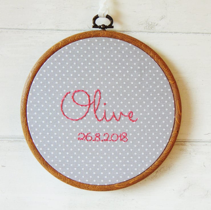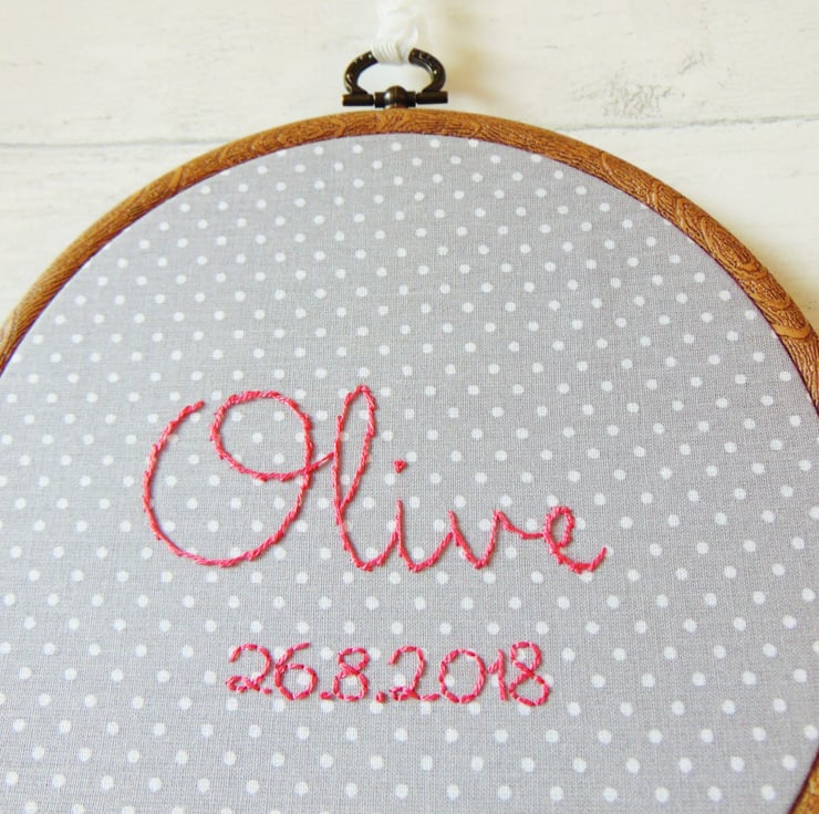 These delightful polka dot name hoops are the perfect addition to any child's room or nursery. Entirely hand stitched to order; you can have any name, date or other wording in any colour which will be sewn onto gorgeous grey polka dot fabric and set in a six inch embroidery hoop.