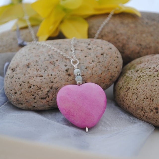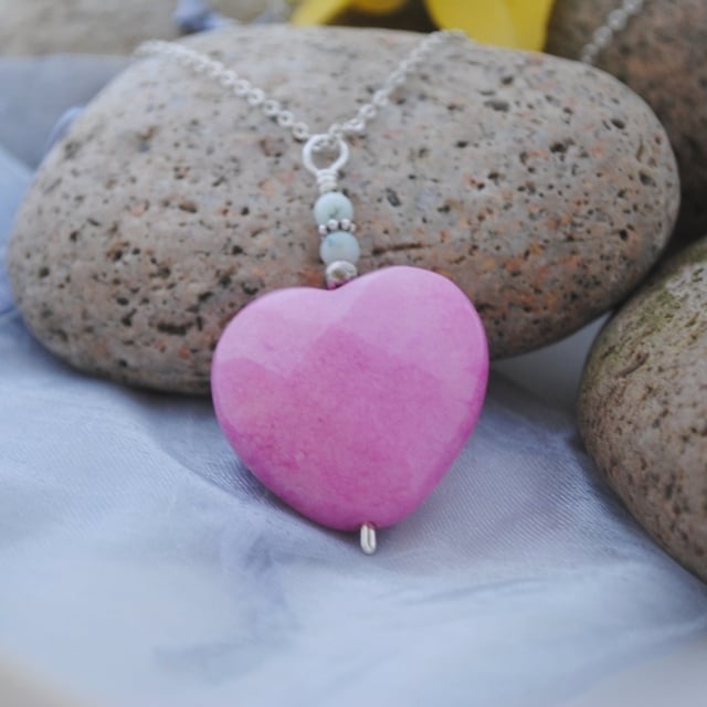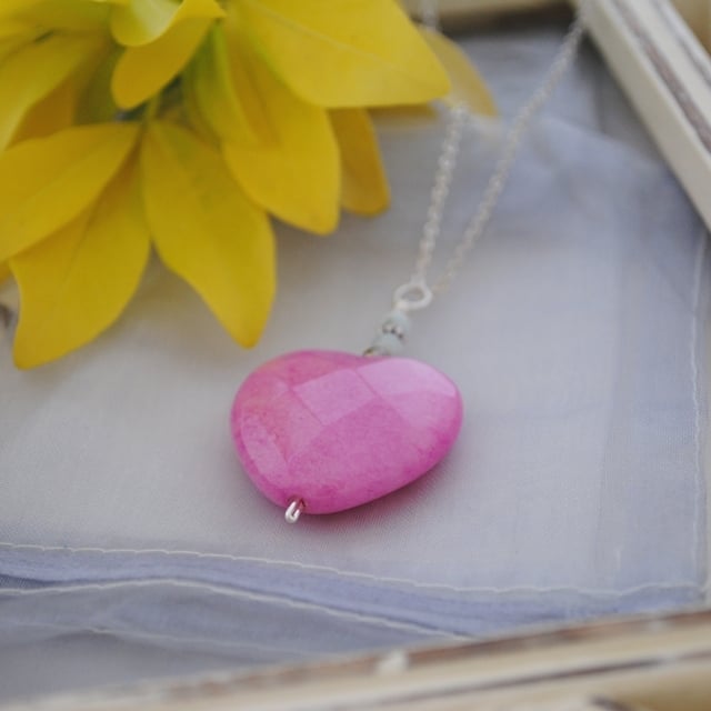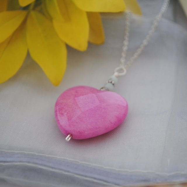 Semi-precious necklace made with a large facetted pink jade heart. The necklace also features two small amazonite beads, a silver daisy spacer and a silver round bead. The heart hangs from a silver-plated chain which is 20.5 inches / 52 cm in length secured by a silver-plated lobster clasp. The heart bead is 3 cm in length.