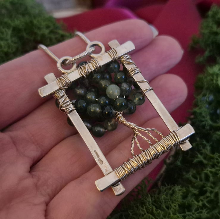 This beautiful tree of life pendant is packed full of gorgeous moss agate semi precious beads. With a frame handcrafted from sterling silver, and a wire wrapped bead structure, it is simply unique - a true one of a kind.