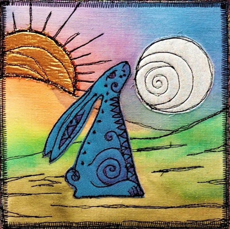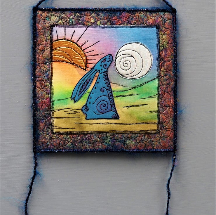 HHE1254 - Sunset Hare Moon Gazer - Square Wall Hanging - 20cm ((8") plus mixed stitched yarn/mohair wool hanging loop, edging and tendrils with handmade/painted, rolled paper beads. Overall length 58cm. Free machine stitching hare, moon and sun detail onto painted cotton. The background is sandwiched shiny fabric snippets and Angelina fibres under organza with free motion/machine embroidery in black thread. Stiffened to keep it's shape. Plain black on reverse (full view in second pic)