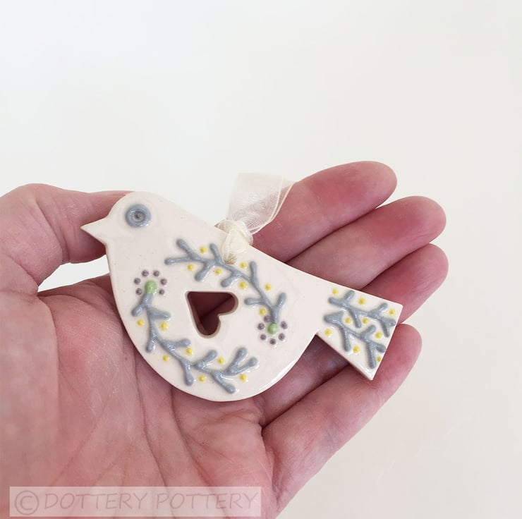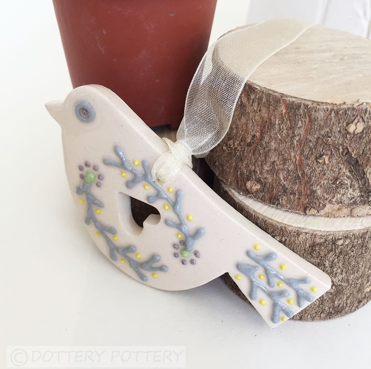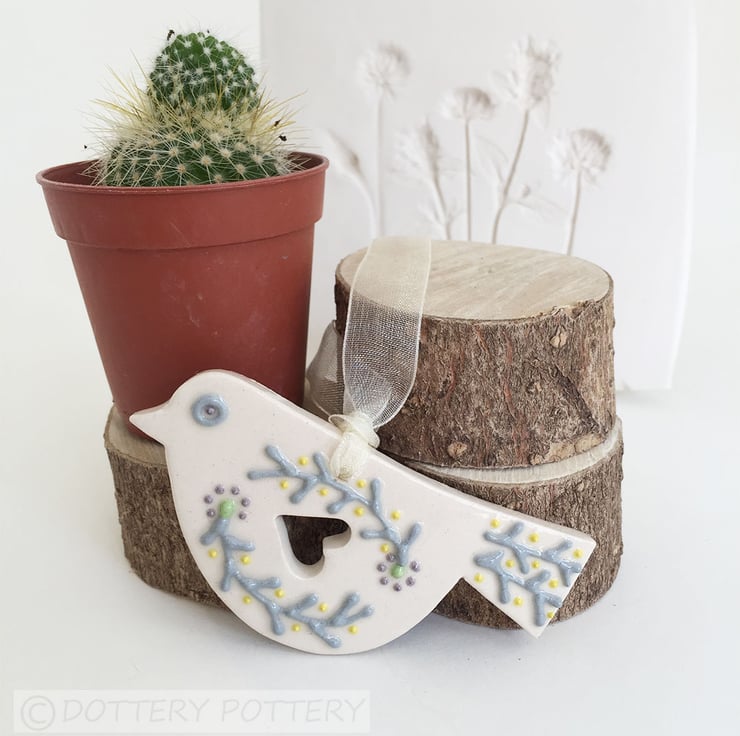 This cute little pottery bird has been hand-cut from a template that I designed myself.