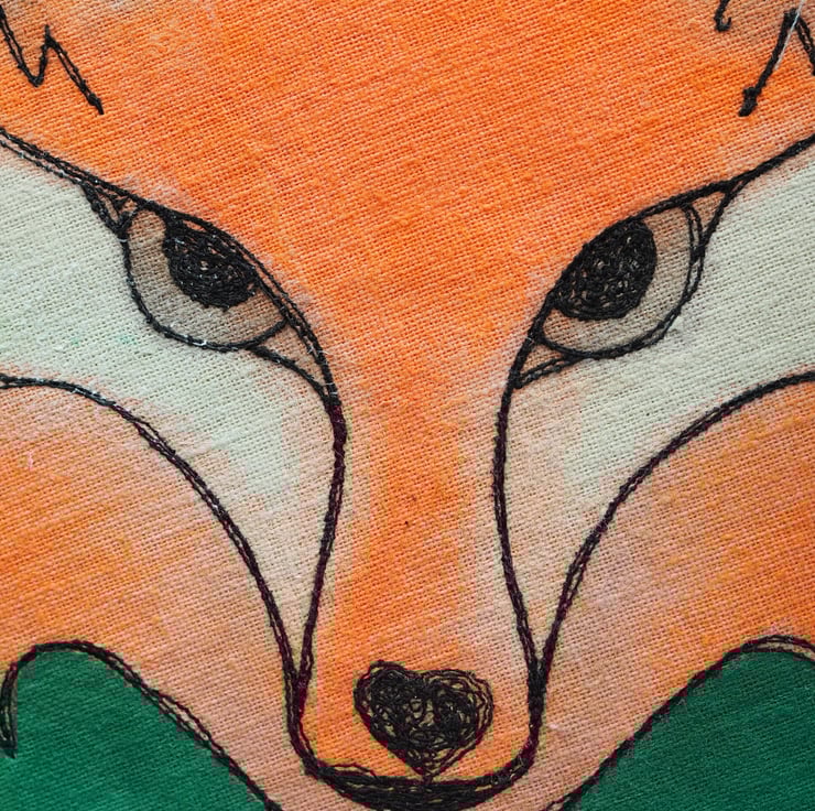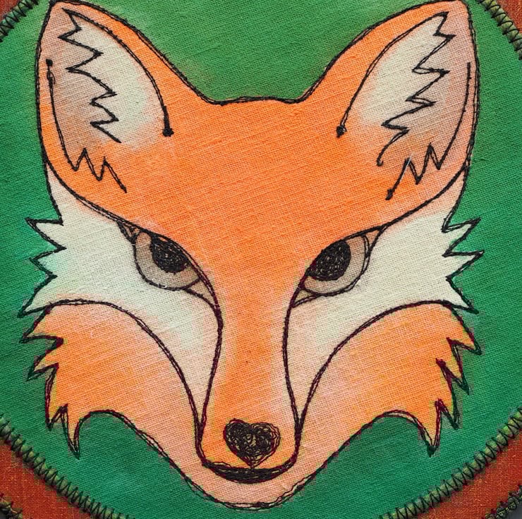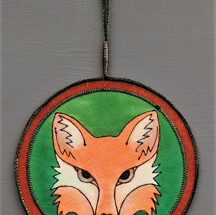 FXPM150 - Foxy Mandala - 20cm round Fox design plus stitched, mixed yarn hanging loop, edging and a handmade painted, rolled paper bead. Stitched in black thread free motion/machine embroidery on cotton and painted with diluted fabric paint on a burnt orange gold background. Stiffened to keep it's shape. Plain black on reverse. Light fast up to a point but I wouldn't advise hanging in direct or bright sunlit areas. (full view in second picture).