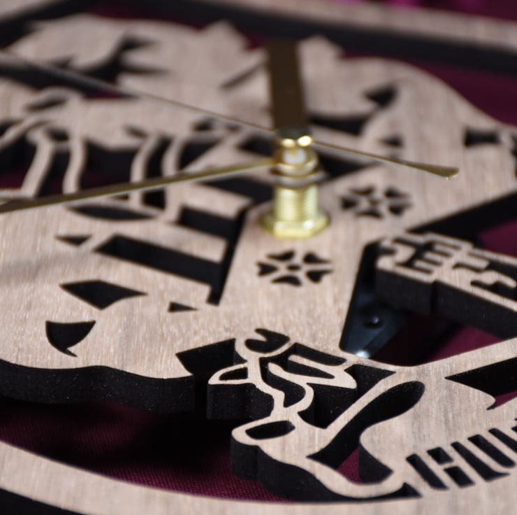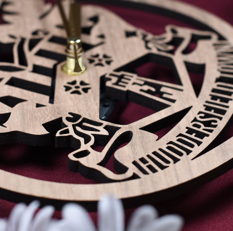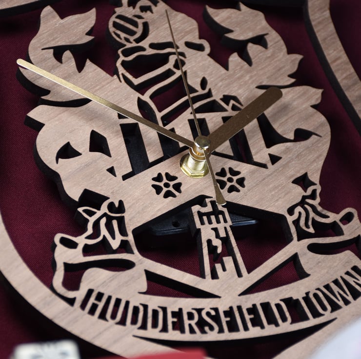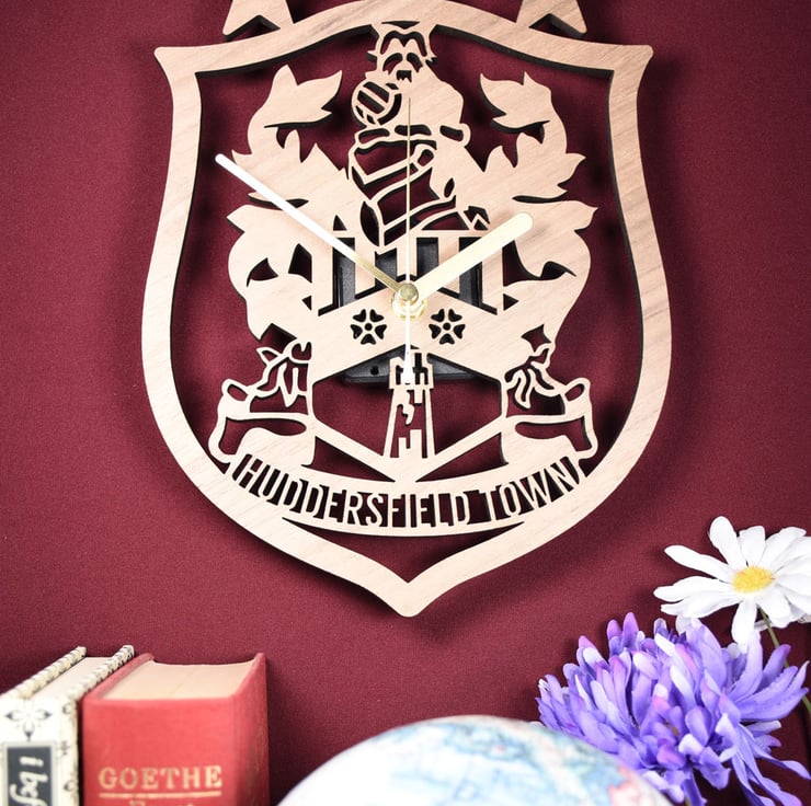 The Huddersfield Town FC Badge Clock is constructed from a high quality walnut veneered mdf. Dimensions: 20cm wide x 28cm tall.