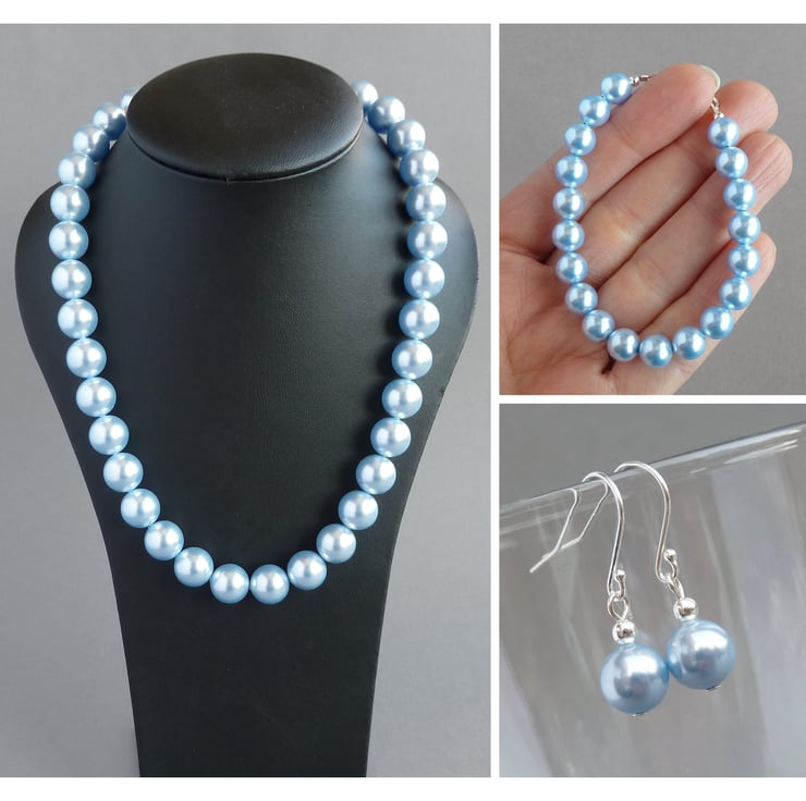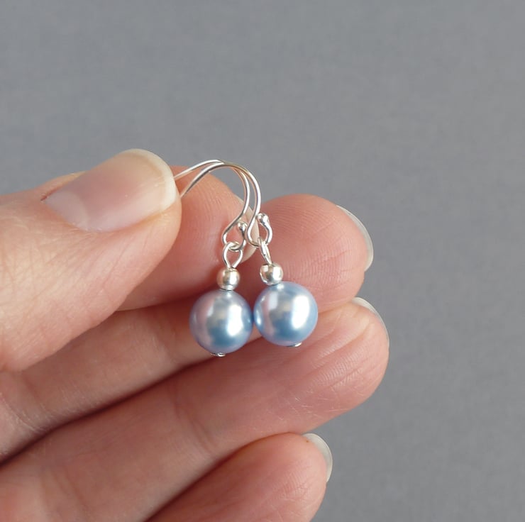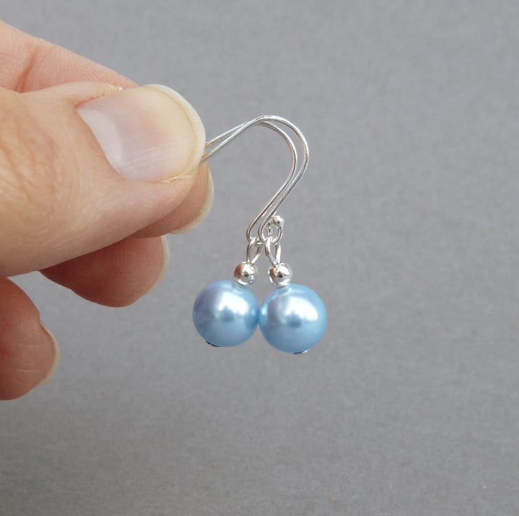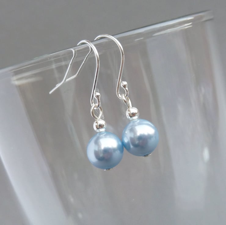 I have used 8mm light blue pearls to create these simple, pearl drop earrings. The simplicity of the pearl drop design and the lustre of the glass pearls make these pale blue earrings perfect for everyday wear or for adding a finishing touch to a special outfit.
