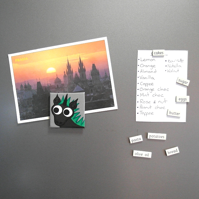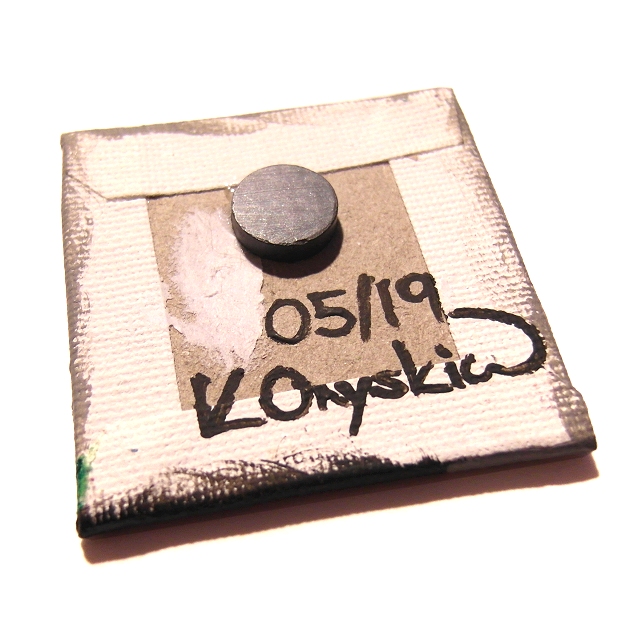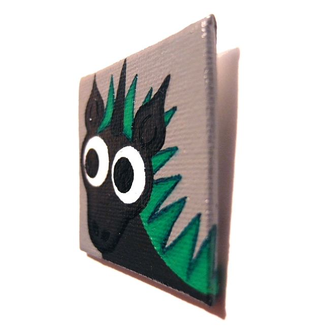The cartoon punk unicorn is painted by Kim Onyskiw in acrylics on a 5cm x 5cm (2" x 2") canvas board, The little piece of art has been coated with a layer of clear varnish to make it more durable, and a 12mm magnet is attached to the back so the painting can stick on a fridge or other magnetic surface.