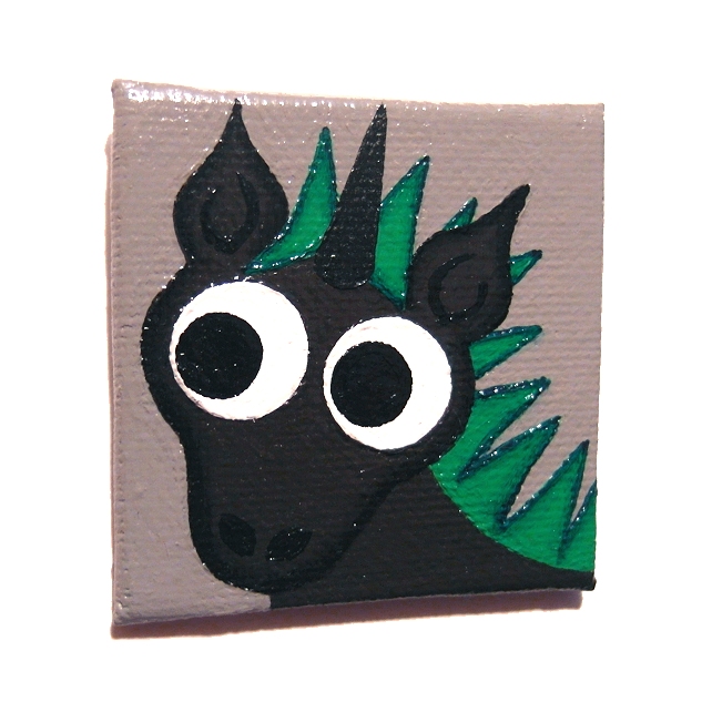 This original painted magnet features a cute, alternative unicorn. The dark mythical creature has a black body, its green mane is spiked into a mohican and its horn is an extra dark black. It stands against a grey background.