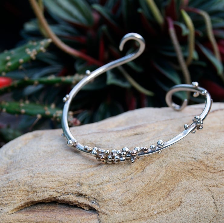 Statement handmade solid sterling silver bangle with silver, rose and yellow gold decor.