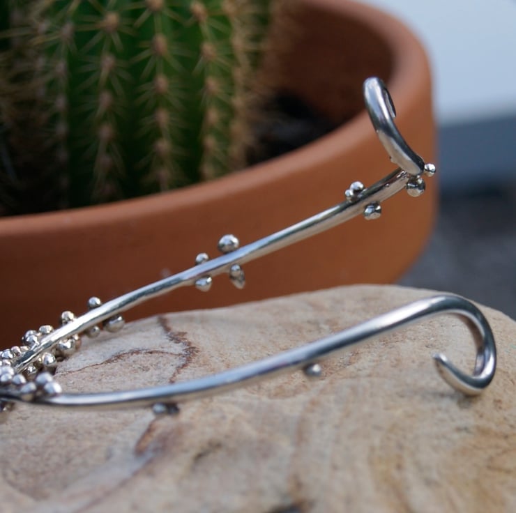 An open style bangle that is graceful and comfortable to wear, each end curls and tapers to represent a wave form and the silver is polished to a high shine.