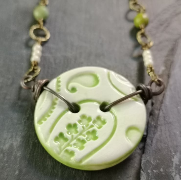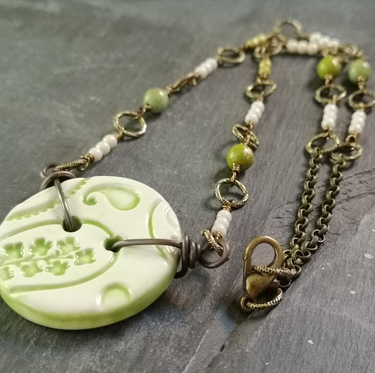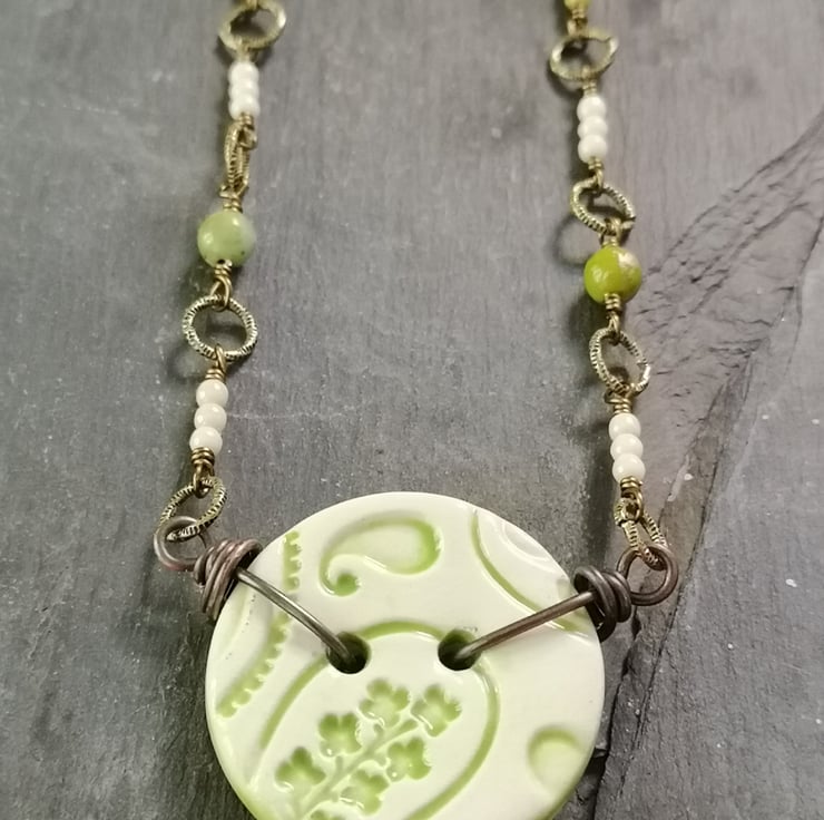 This pretty necklace has a beautiful handmade ceramic button as its focal point. The colours from the button are picked out in the tiny green and cream glass beads which I've wire wrapped and made into links. These links have been attached together with decorative jump rings and a short length of antique gold chain sits around the back of the neck. A simple trigger clasp has been used as a fastener.