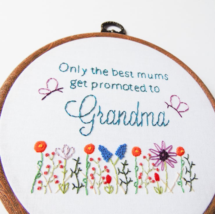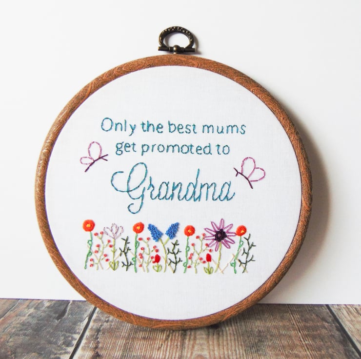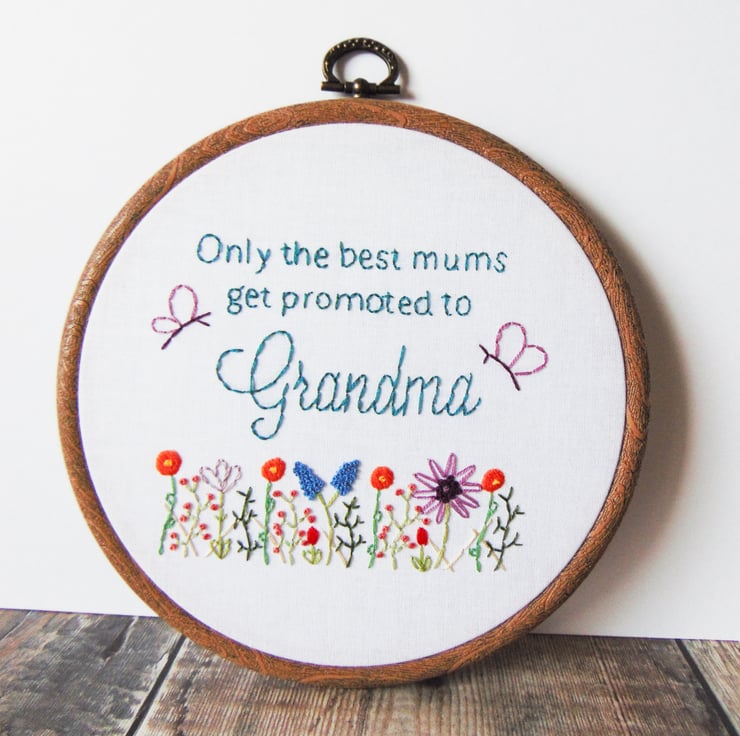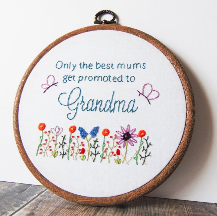 Beautiful 'Only the best mums get promoted to' hoop, the perfect gift whether you are or will soon be a grandma, nanny, nan, gran...you name it. These are hand stitched to order and feature my signature wildflower garden with two butterflies. I am happy to change the wording to suit and you order will come sewn onto white fabric and set in a six inch hoop.
