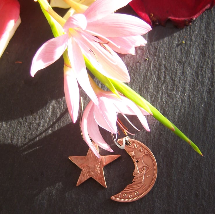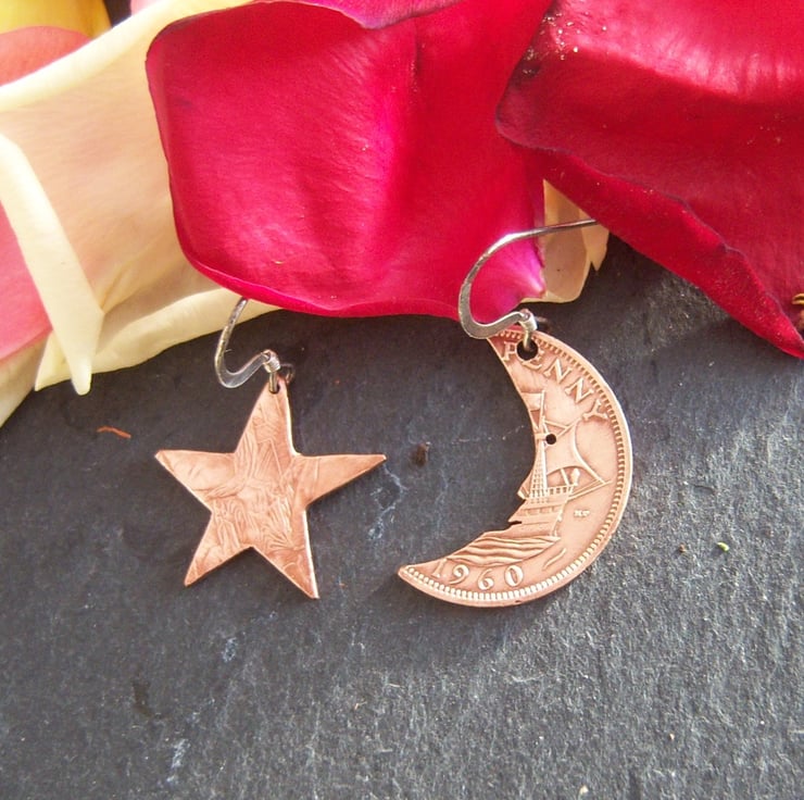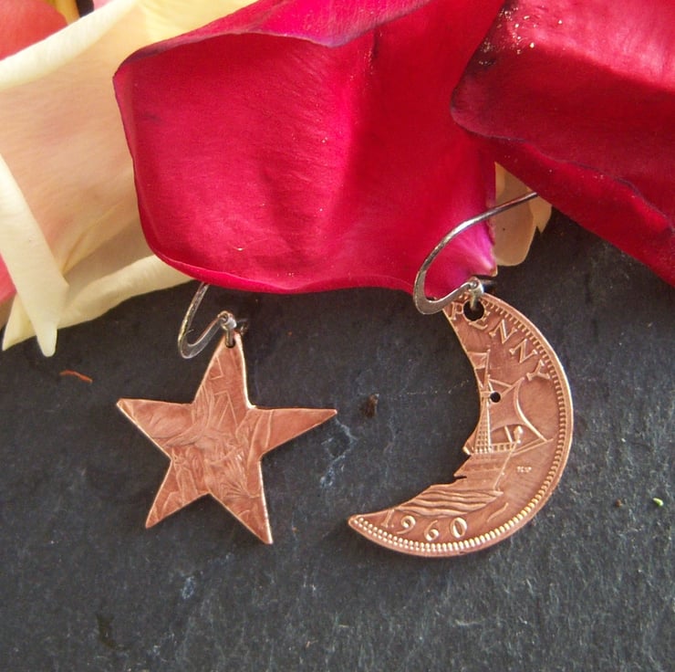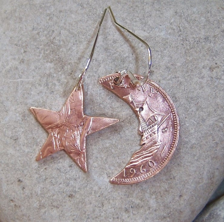 A pair of earrings hand cut from old bronze pre-decimal coins. The star is cut from a penny and is approximately 2cms point to point. The moon is cut from a 1960 halfpenny and "the man in the moon" face is cut into this. It measures approximately 2.5cms point to point. Sterling silver ear wires attached.