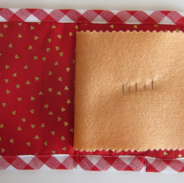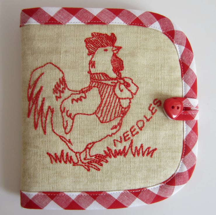 Lightly padded cream sewing needle case with machine embroidered design of a cockerel in red. Edged with red and white gingham and backed with a red and gold hearts fabric.