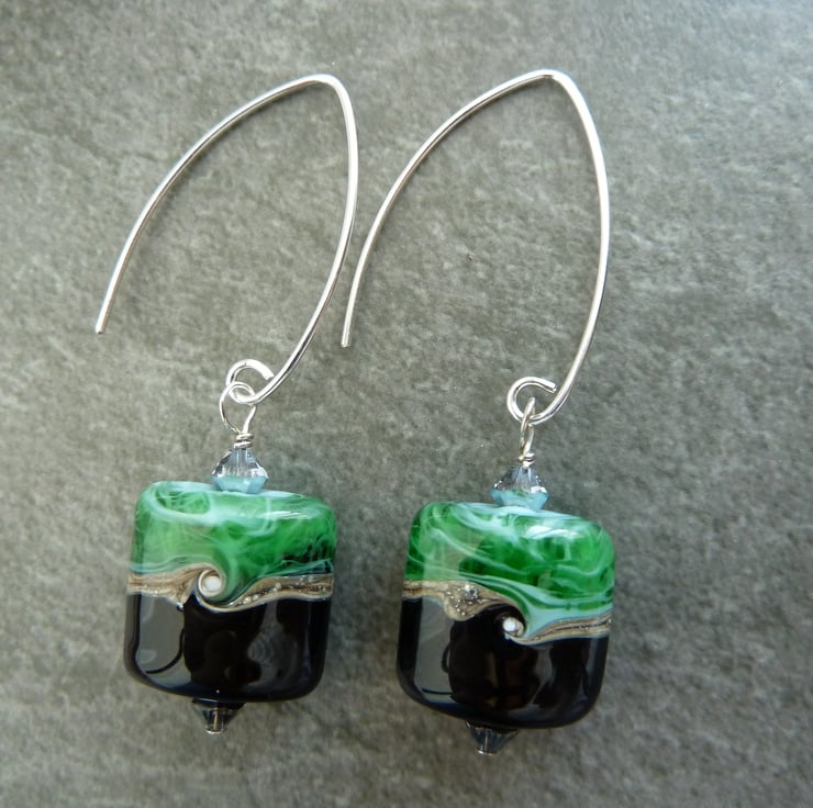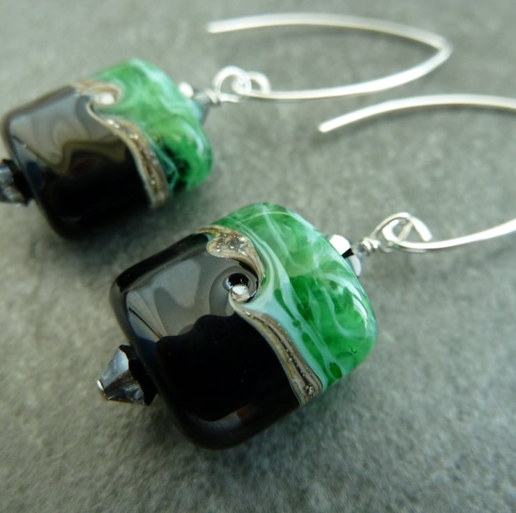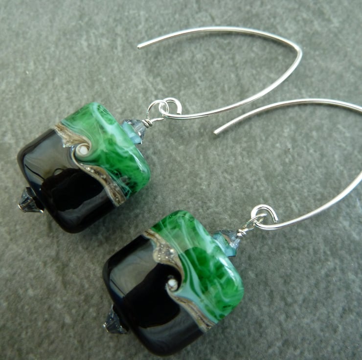 A pair of earrings made with handmade sterling silver ear wires, swarovski crystals and handmade lampwork glass beads made with green and black glass.