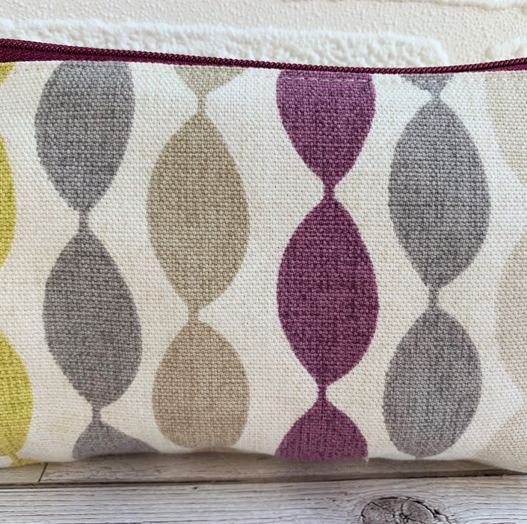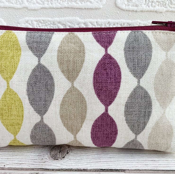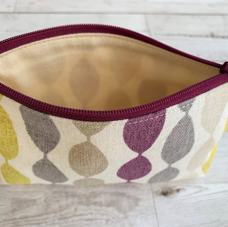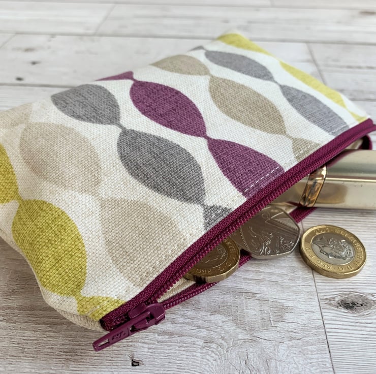 A large coin purse in an attractive print fabric with a vibrant abstract pattern of wiggly stripes on a cream background. The stripes are a mix of bold and neutral shades, including purple, yellow-green, beige and grey. The coin purse has a matching purple zip and is lined with cream fabric. The base of the purse is boxed to give more space inside.