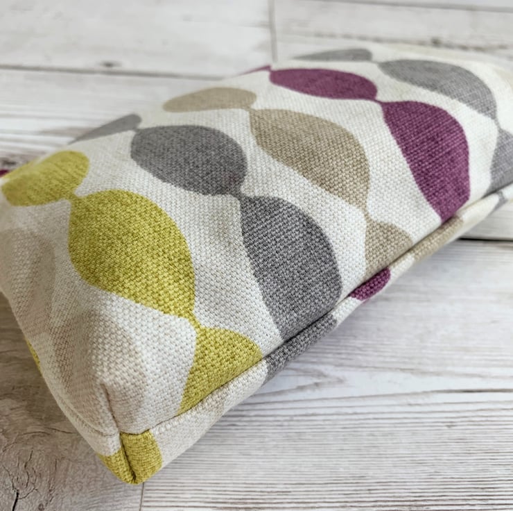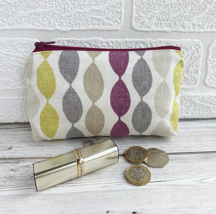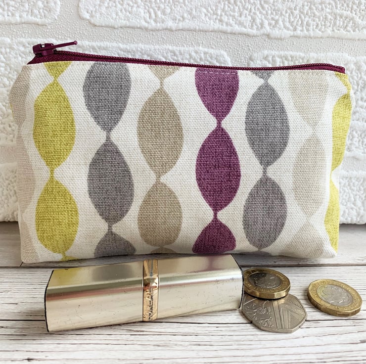 This large purse could be used as a coin purse and is large enough for bank cards and keys. It is also large enough to be used as a small make up bag or as a mobile phone pouch. With its lovely vibrant colours and bold pattern, it would make a lovely small gift.