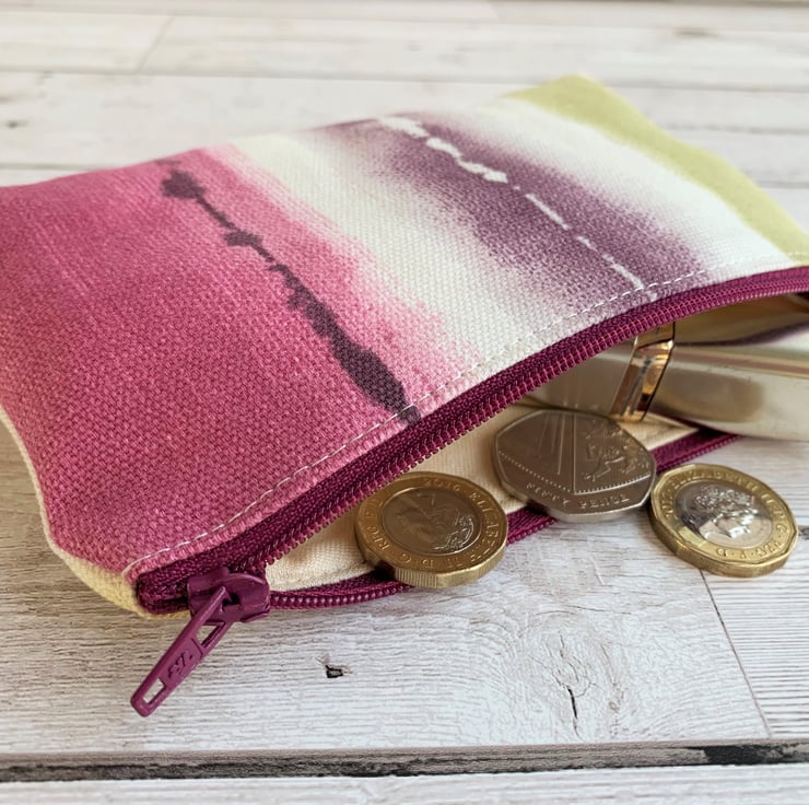 This large purse could be used as a coin purse and is large enough for bank cards and keys. It is also large enough to be used as a small make up bag or as a mobile phone pouch. With its lovely shades of colour, it would make a lovely small gift.