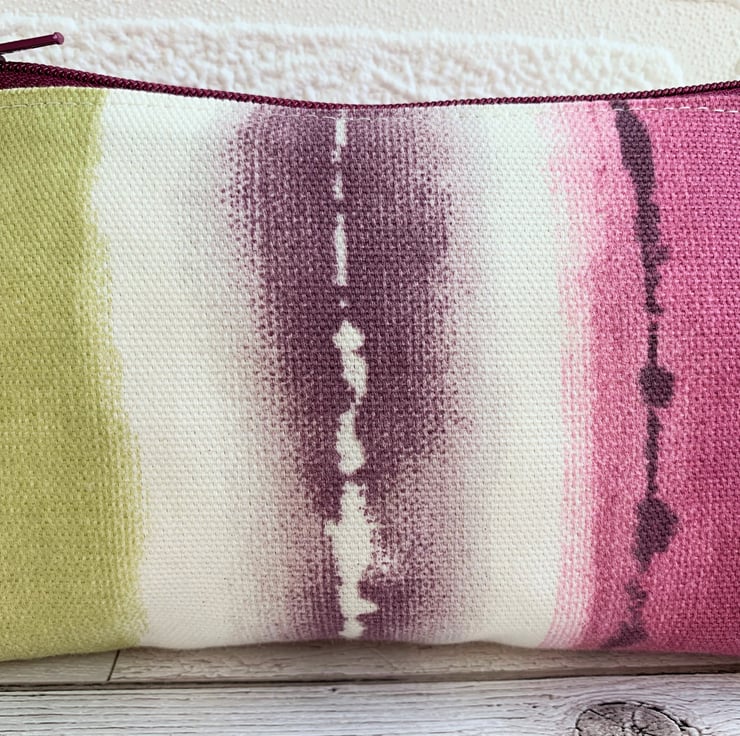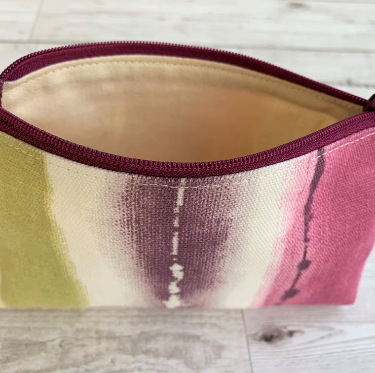 A large coin purse in an attractive print fabric featuring wide patterned stripes in lovely shades of deep pink, plum purple, sage green and cream. The coin purse has a matching purple zip and is lined with cream fabric. The base of the purse is boxed to give more space inside.