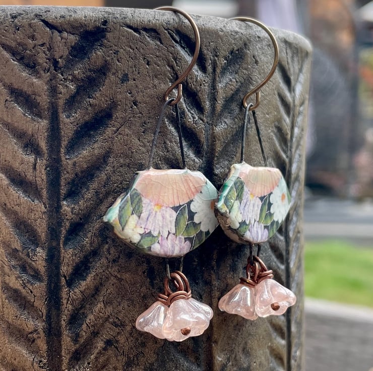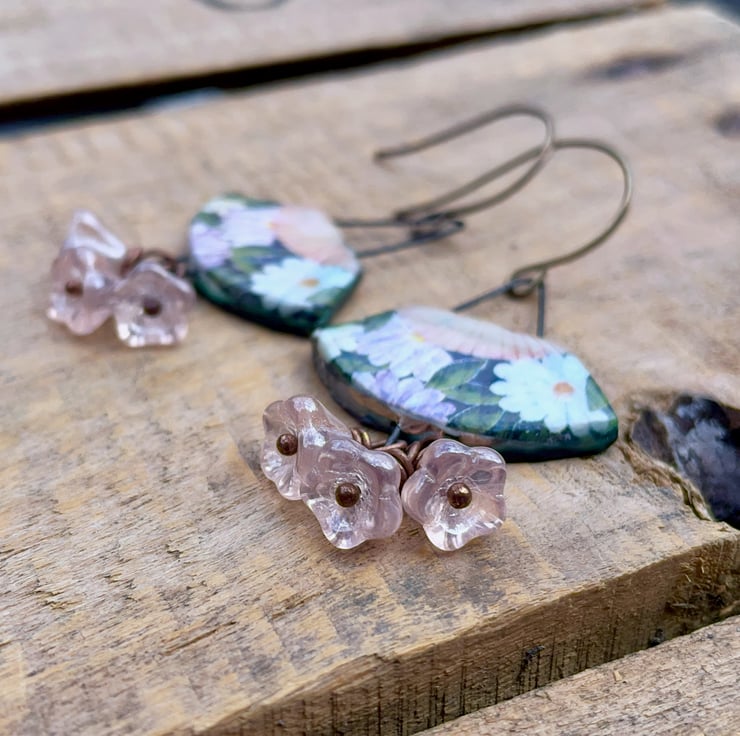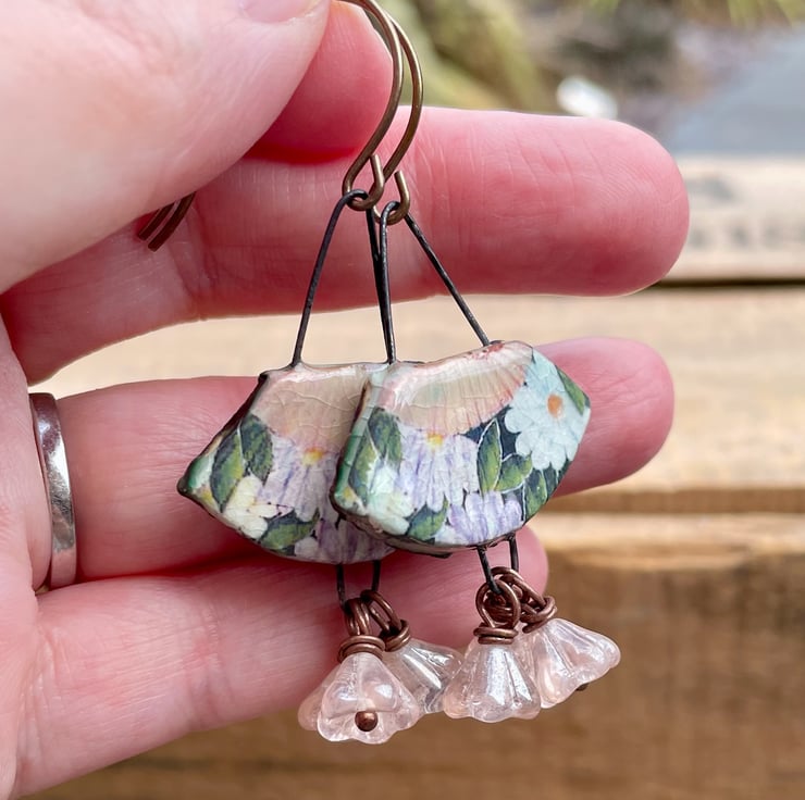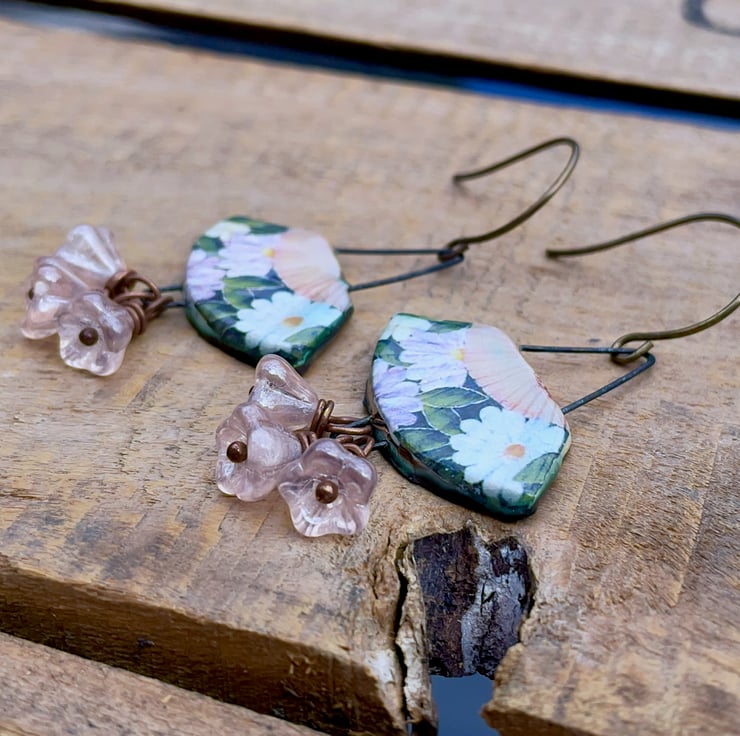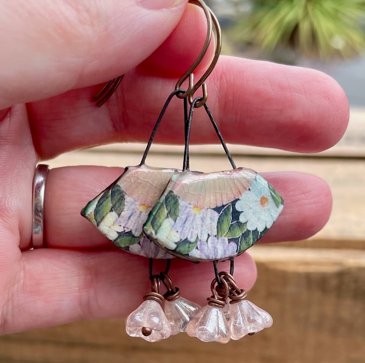 Each pair features fan-shaped ceramic charms created by bead artist Petra Carpreau, decorated with a vintage-inspired floral decal on the front and finished with a soft iridescent glaze on the back.
