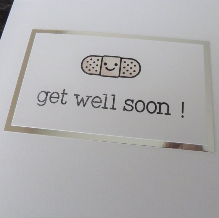 A handmade card which features a hand stamped image of a plaster with the words 'get well soon'. The image has been hand coloured.