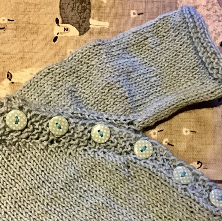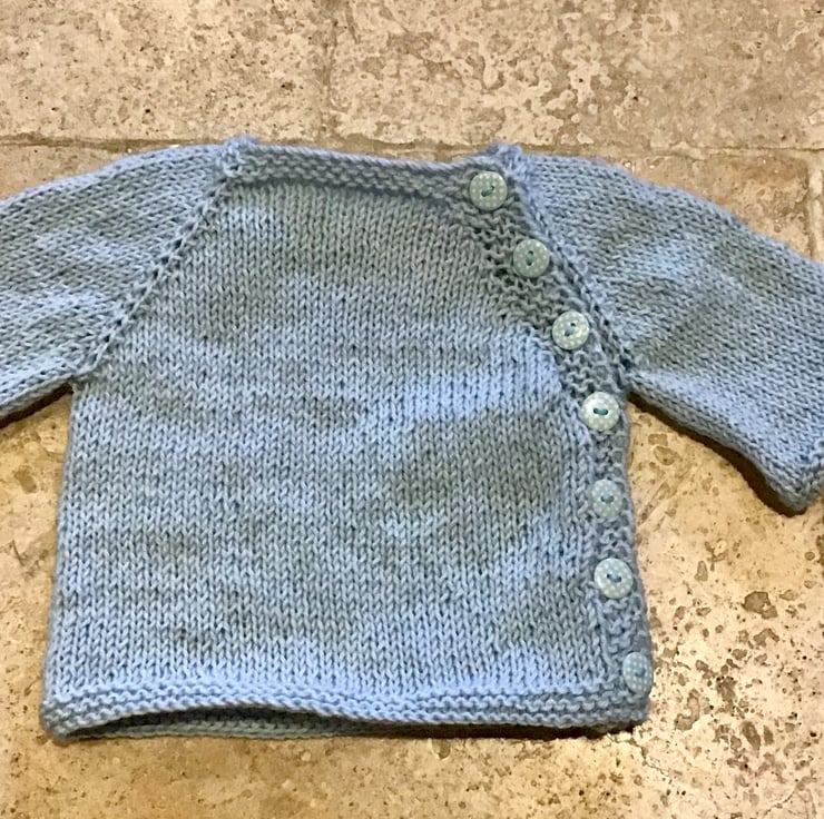 A modern style cardigan for a newborn baby up to 9lb in weight. Hand knitted in Lancashire using British wool. Duck egg blue with co-ordinating buttons. 75% wool 25% nylon. Machine washable at 30 degrees. Pattern Kelly Brooker.