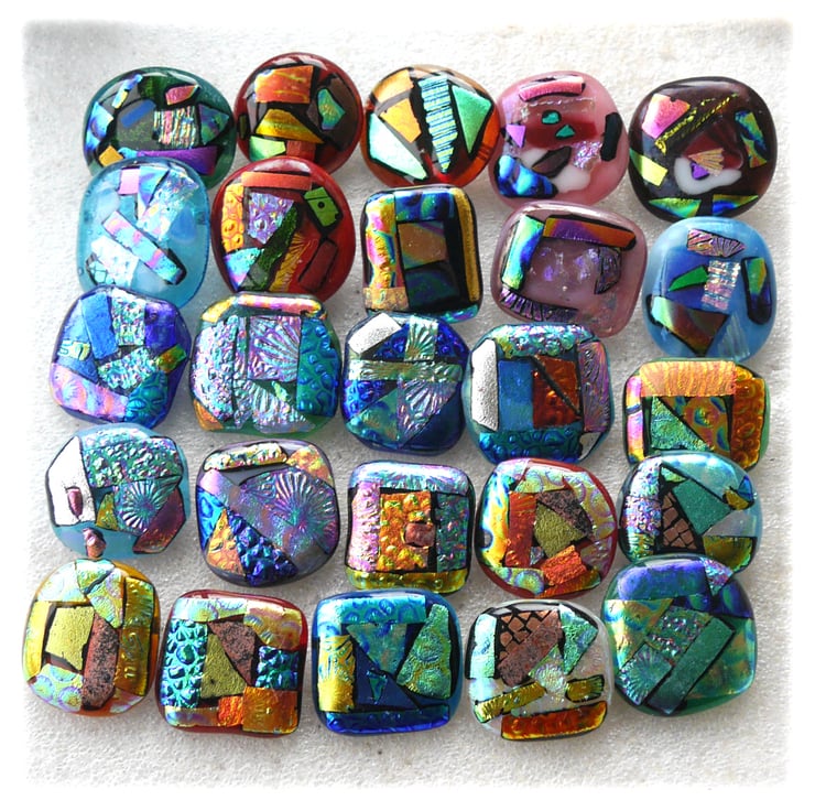 The last photo shows 25 brooches in all, as I make these in small batches in my little kiln. They are for sale here as separate listings. You can find them all by clicking the "Patchwork dichroic glass brooch joysofglass" tag on this listing.