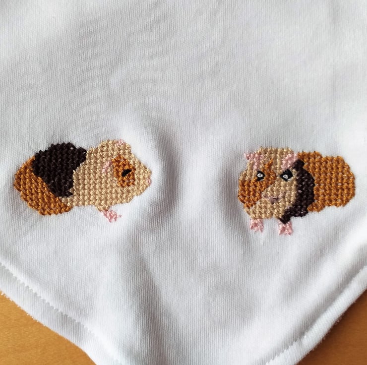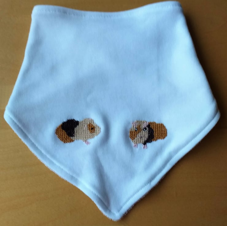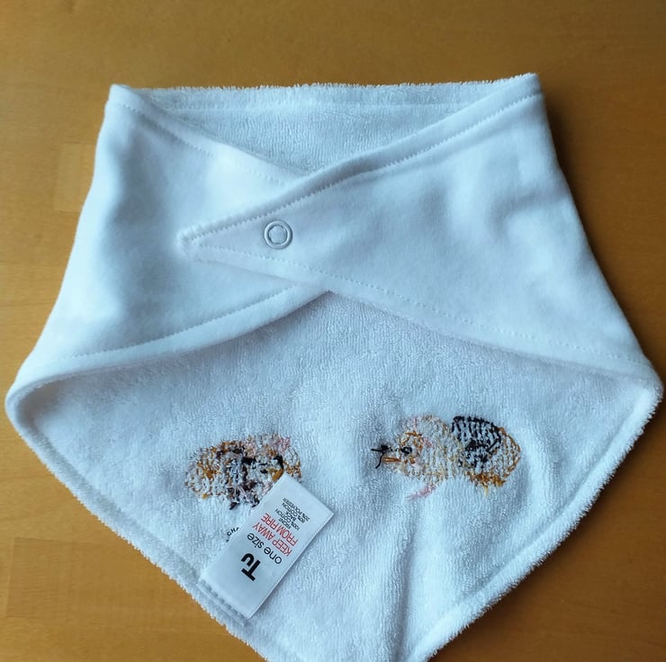 This white dribble bib with adjustable press stud fastening upon which I have hand embroidered two tan and dark brown guinea pigs has been made to order and is not available for general sale.