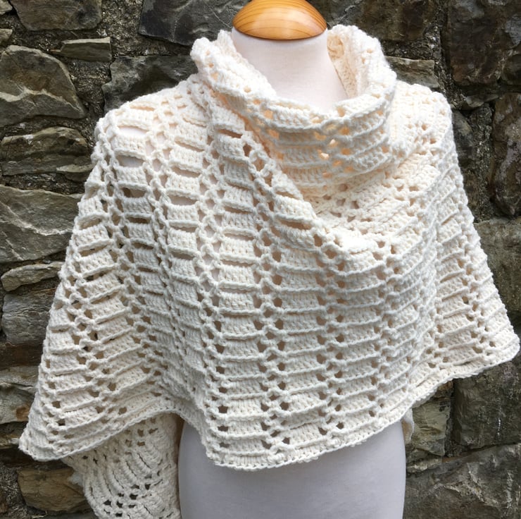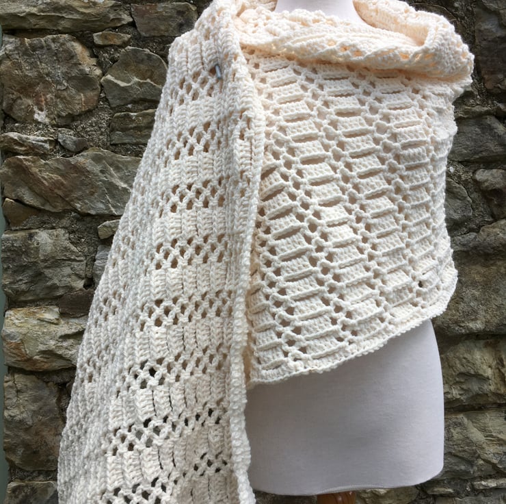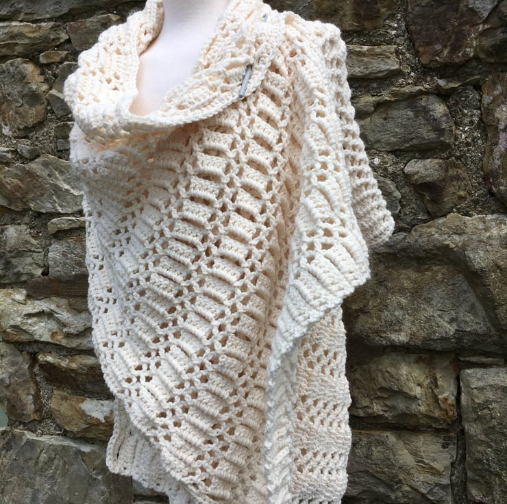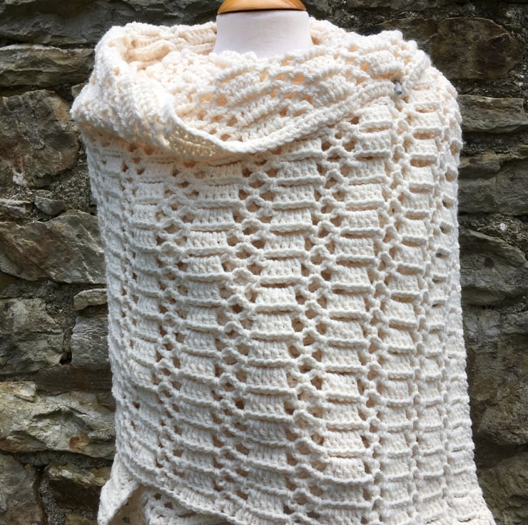 Handmade shawl in cream Aran weight super soft yarn with 1/5 wool content.