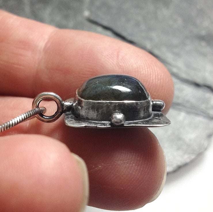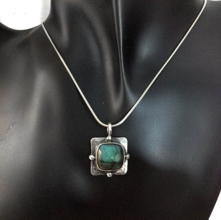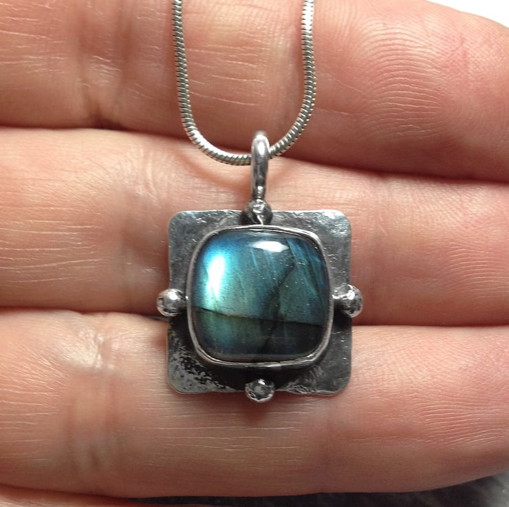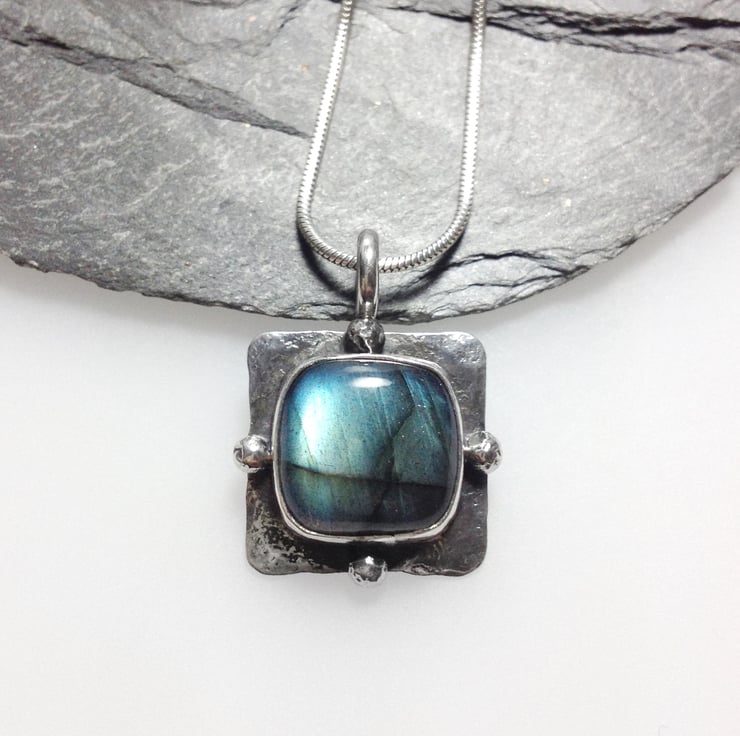 This flashy labradorite stone has been simply set on a square of beaten silver. I have added some decorative silver bobbles on the four sides and added a large bail, so it easily slides on and off the chain.