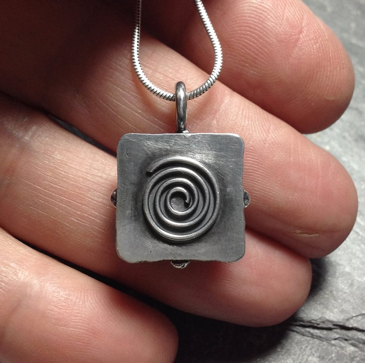 On the back of the pendant I have added a large spiral. All the silver has been oxidised dark in the recesses, then polished.