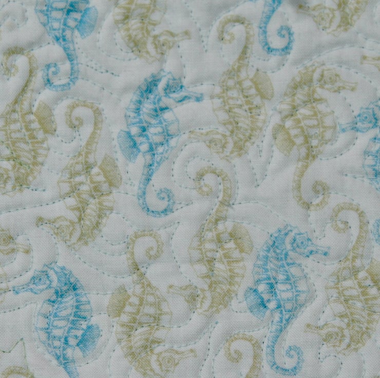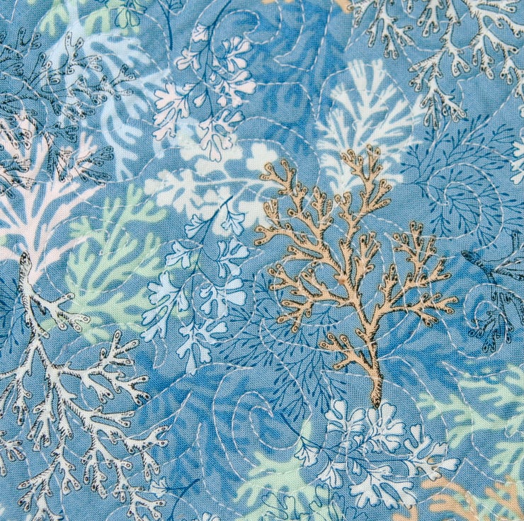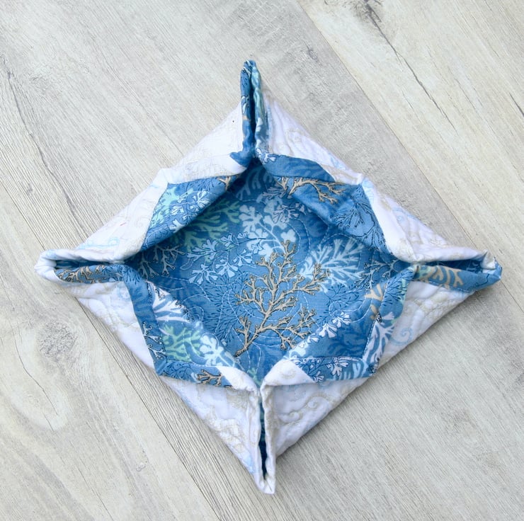 Made using a mixture of dark blue fabric featuring coral, and a white fabric with Seahorses, these boxes are quilted with a polyester/cotton blend wadding to give the box some shape. The edges are bound using a scrappy binding made using the same fabric as the main box. Finally the corners are folded in and hand sewn to the edge to give stability to the edges of the box.