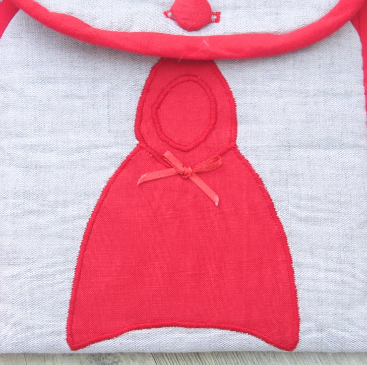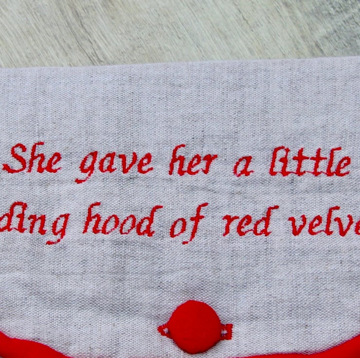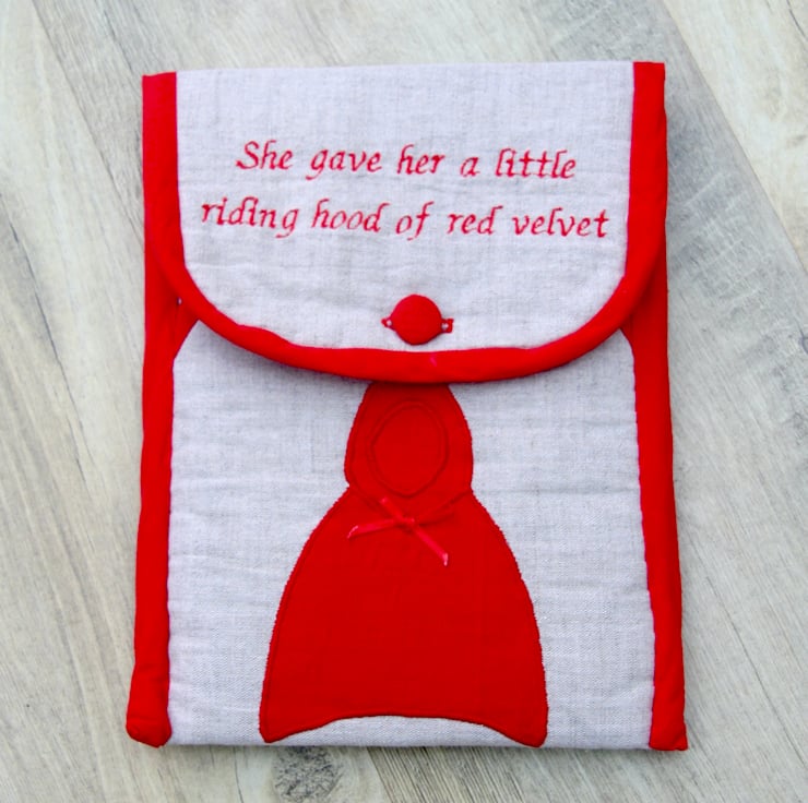 REDUCED TO CLEAR - An elegant tablet case, designed to fit an iPad Mini or similar sized tablet. The flap features a quote from Little Red Riding hood with an appliqué picture to match on the main front section.