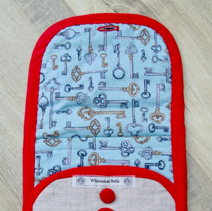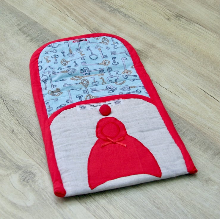 The exterior of the case is made from a linen/cotton blend fabric with cotton appliqué. The interior and pocket are lined with a high quality cotton, with a vintage keys design. The case is also padded with a fusible polyester wadding to provide some protection for your device. A flap closure with button will also help to protect your device from dust and other particles.