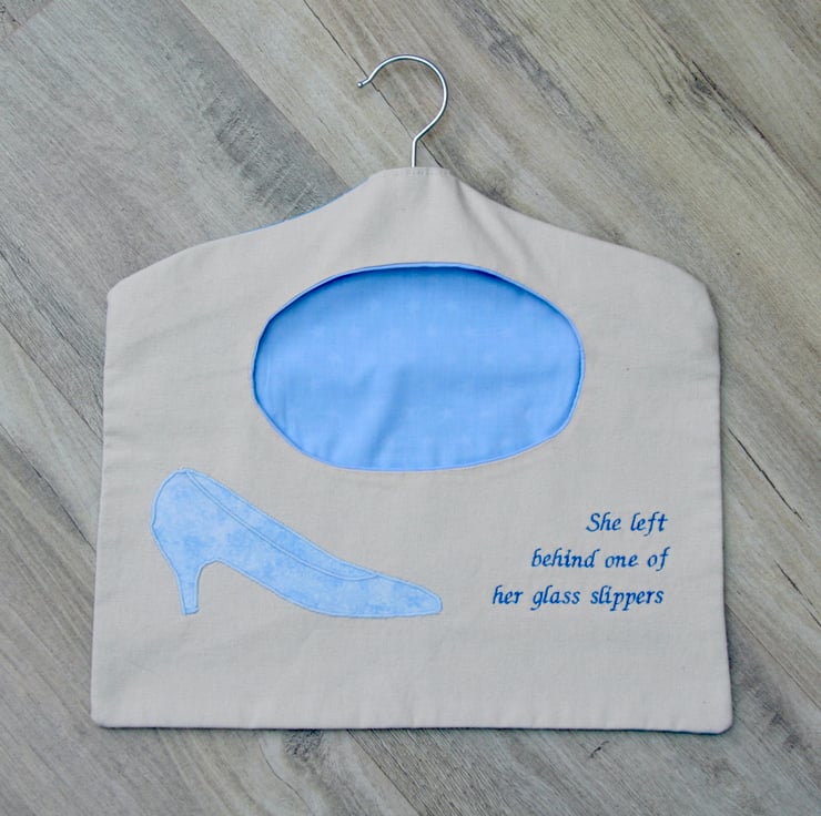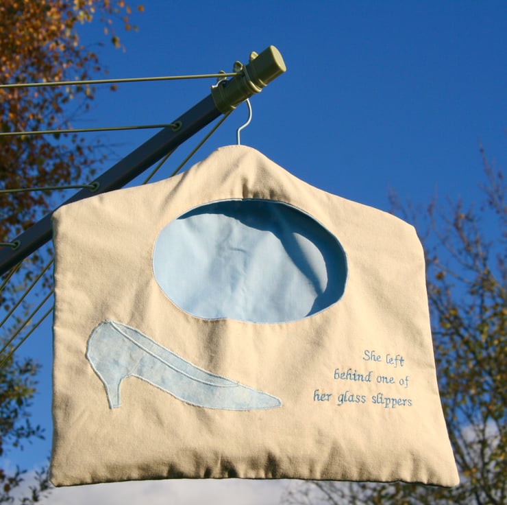 REDUCED TO CLEAR: An elegant Peg Bag with a fairytale design featuring an appliqué slipper design and embroidered quote from Cinderella. The front is made from a linen cotton blend fabric and the backing fabric is a quality cotton fabric with a stars design. The interior is lined with blue cotton.