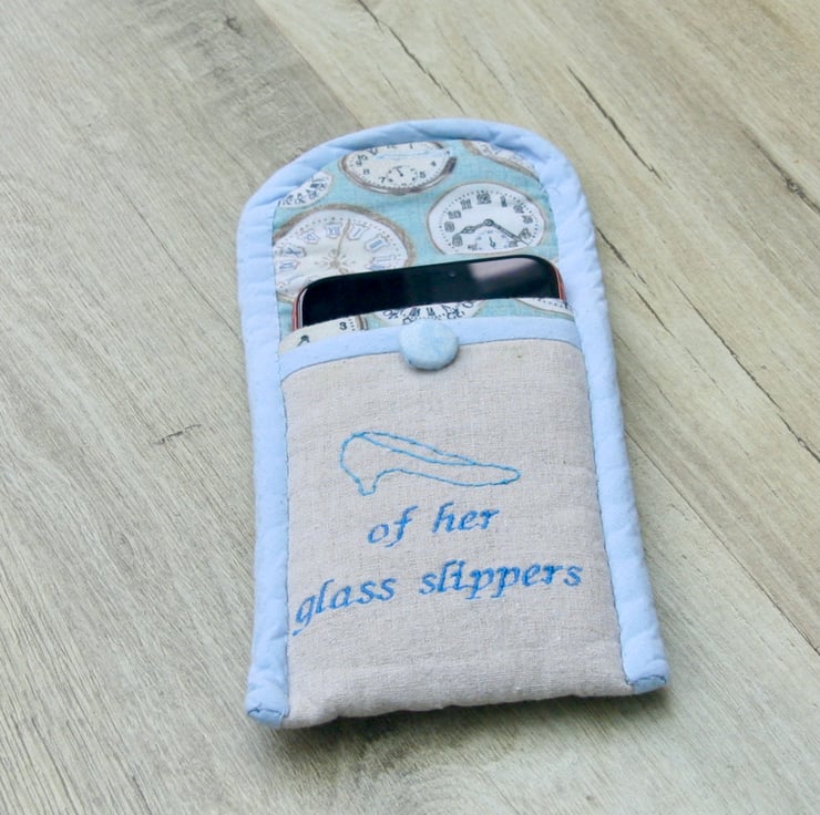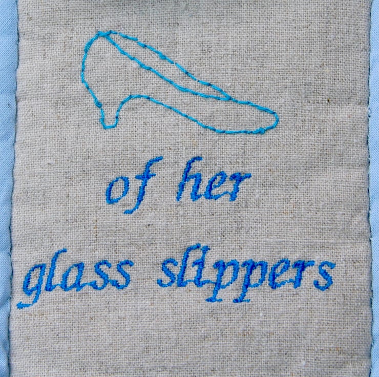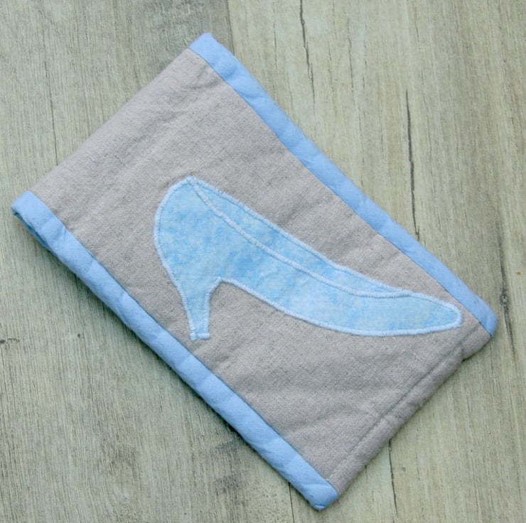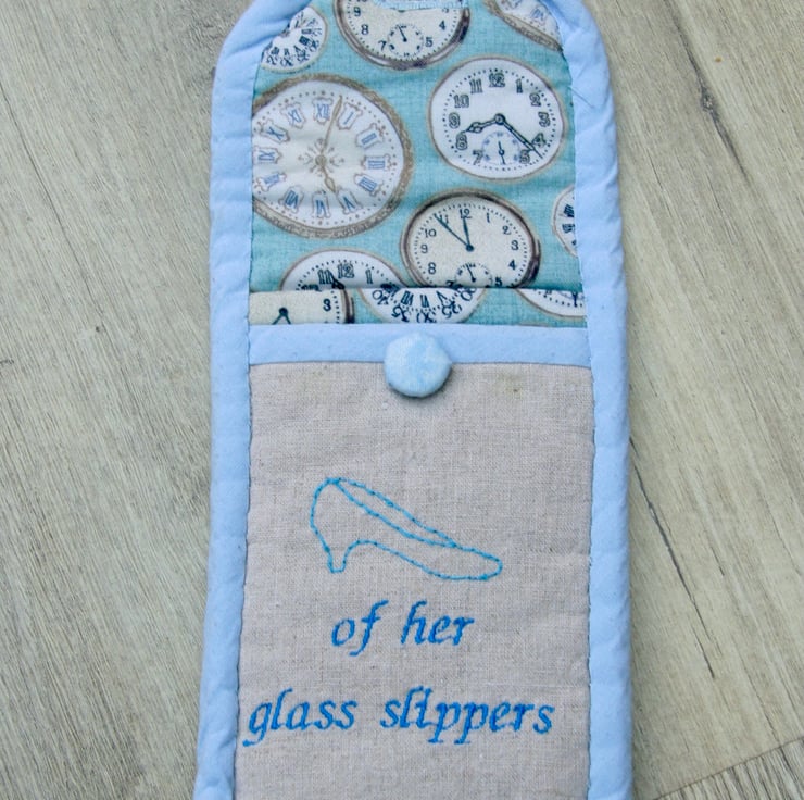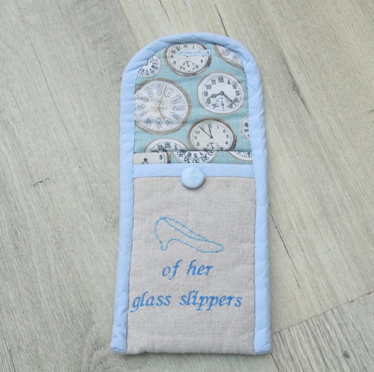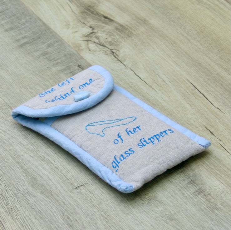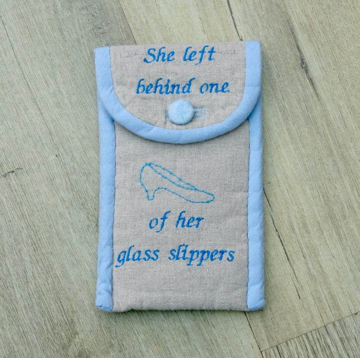 The case is made from a linen/cotton blend fabric with a fairy tale appliqué picture of Cinderella's slipper on the back. On the front of the case is the quote 'she left behind one of her glass slippers'.