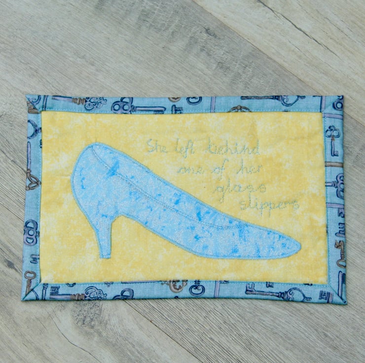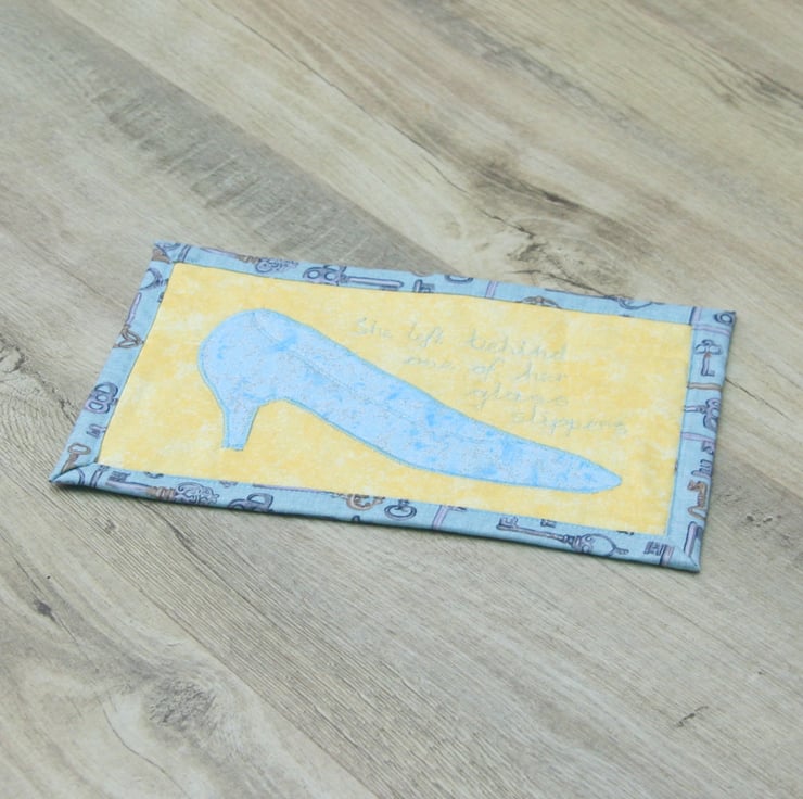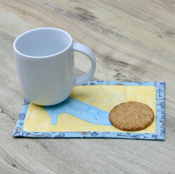 This fairytale mug rug, with Cinderella's glass slipper, is big enough to accommodate your drink and a cheeky biscuit.