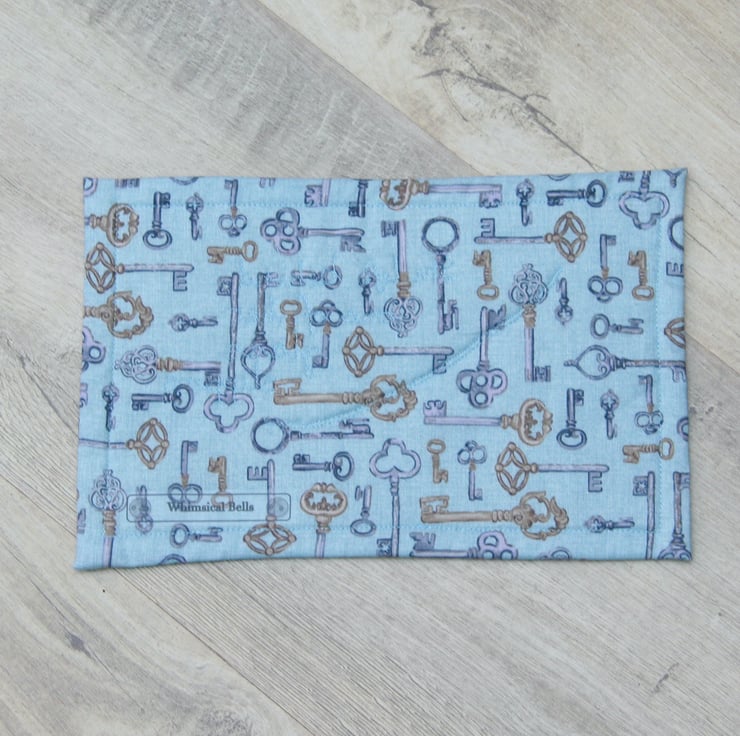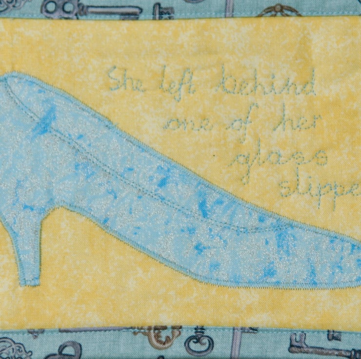 The front has a yellow background and features an appliqué glass slipper. The back is a print fabric which features old fashioned keys, with a middle layer of cotton wadding. The quilting of the three layers is used to give detail and depth to the slipper and also to add the 'She left behind one of her glass slippers' quote from the classic fairytale.