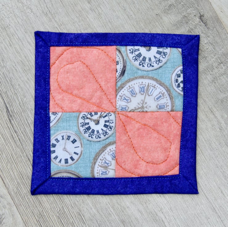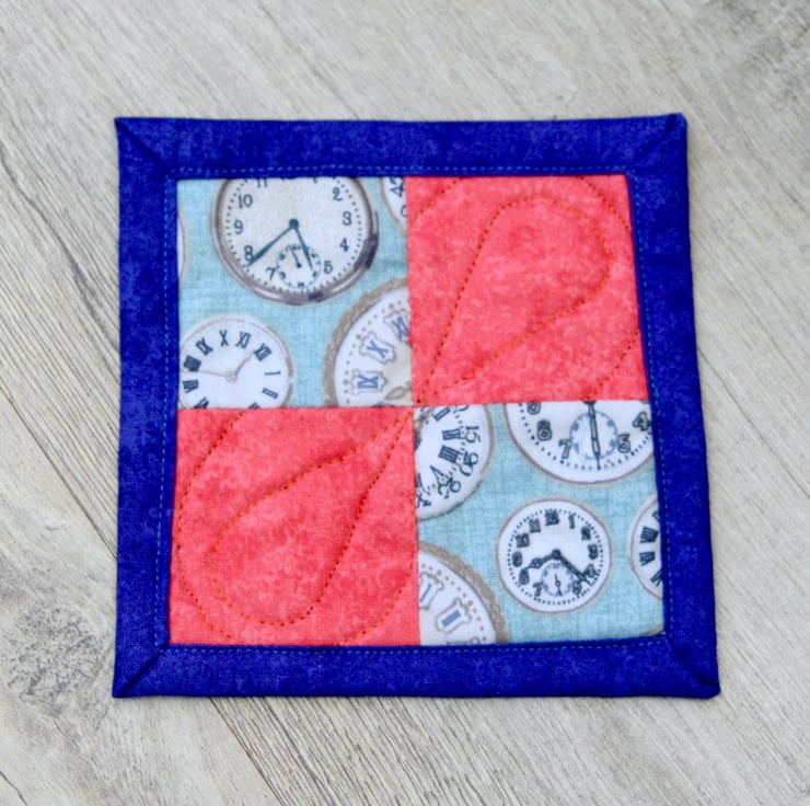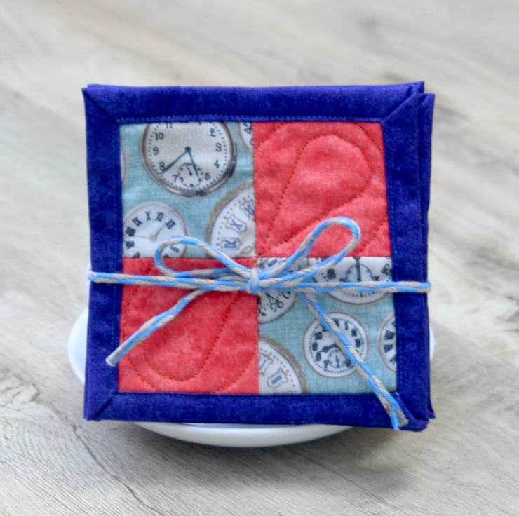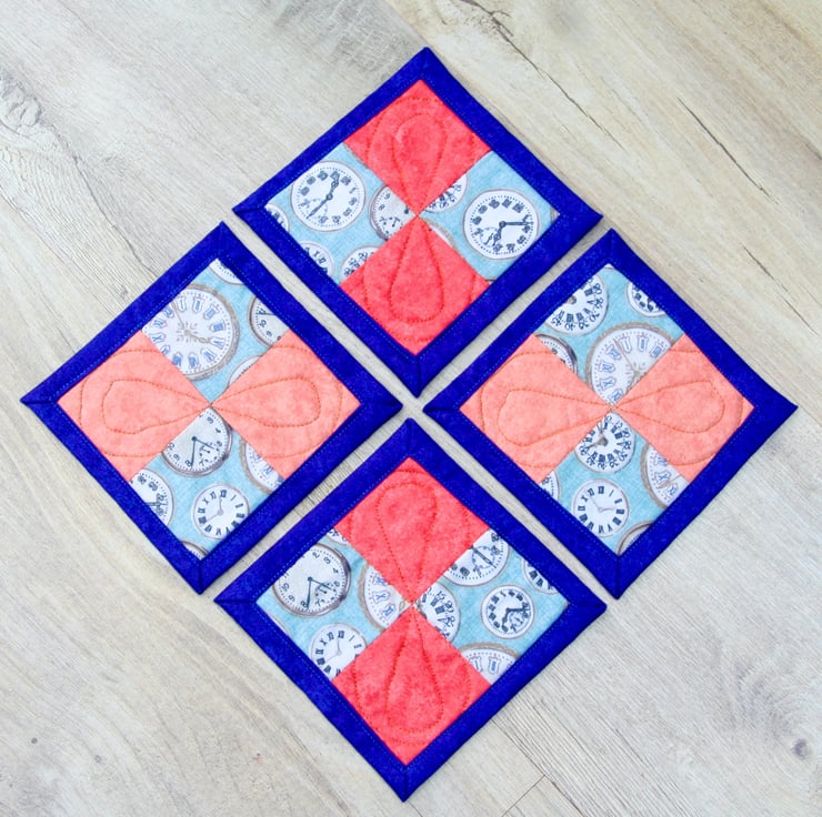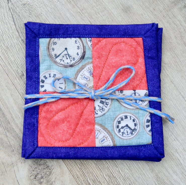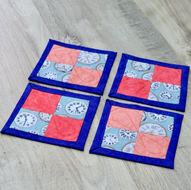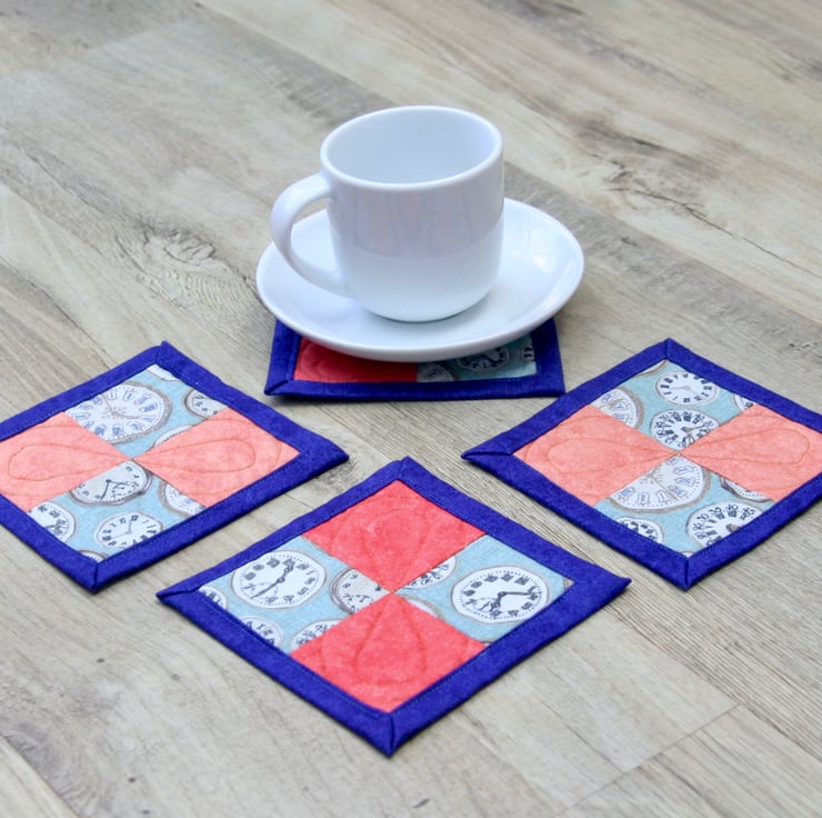 The front of the coasters features clock themed cotton fabric partnered with plain coral cotton fabric. They are quilted with a polyester/cotton blend wadding and backed with blue cotton backing fabric, which is used to bind the coasters.