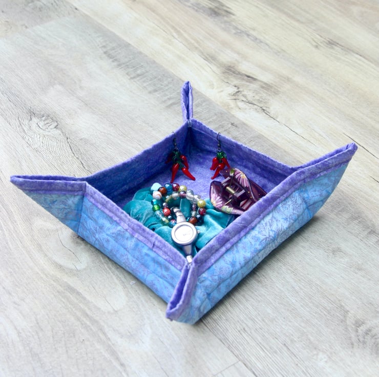 Made using a mixture of blue glittery and purple spraytime fabric, this box is quilted with a polyester/cotton blend wadding to give the box some shape. The edges are bound using a the same purple fabric as the inside of the box. Finally the corners are folded in and hand sewn to the edge to give stability to the edges of the box.
