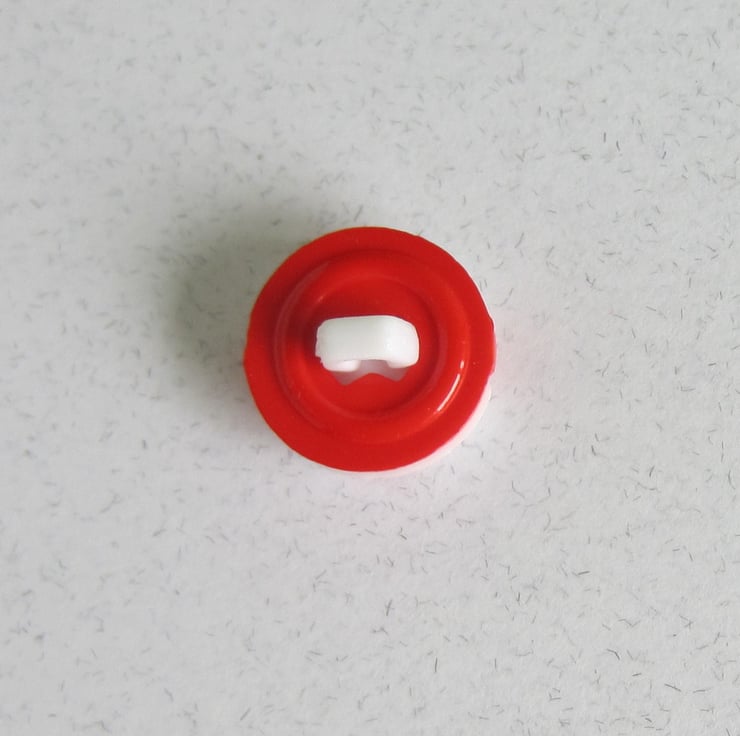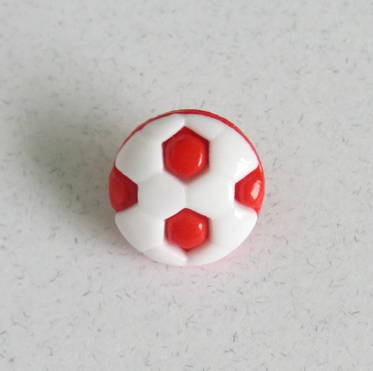 10 plastic red and white buttons in the shape of footballs with a shank. Each button measures 14 mm across.
