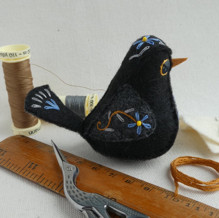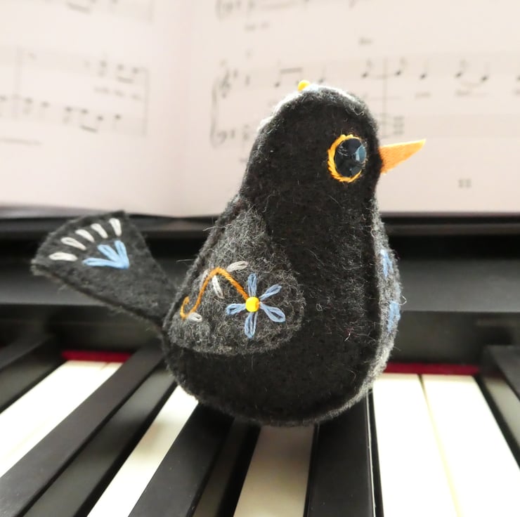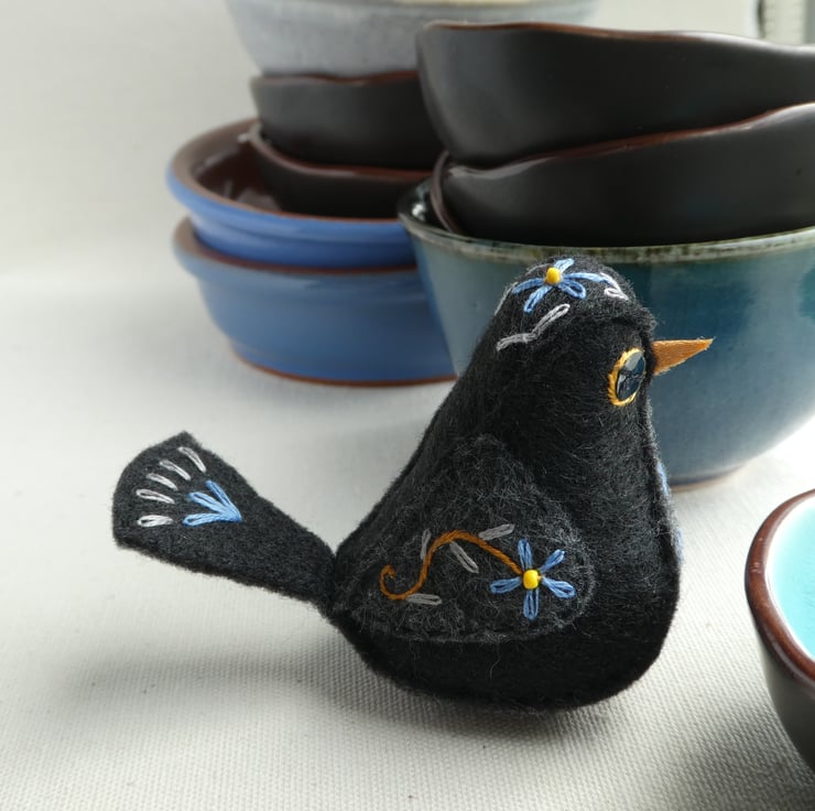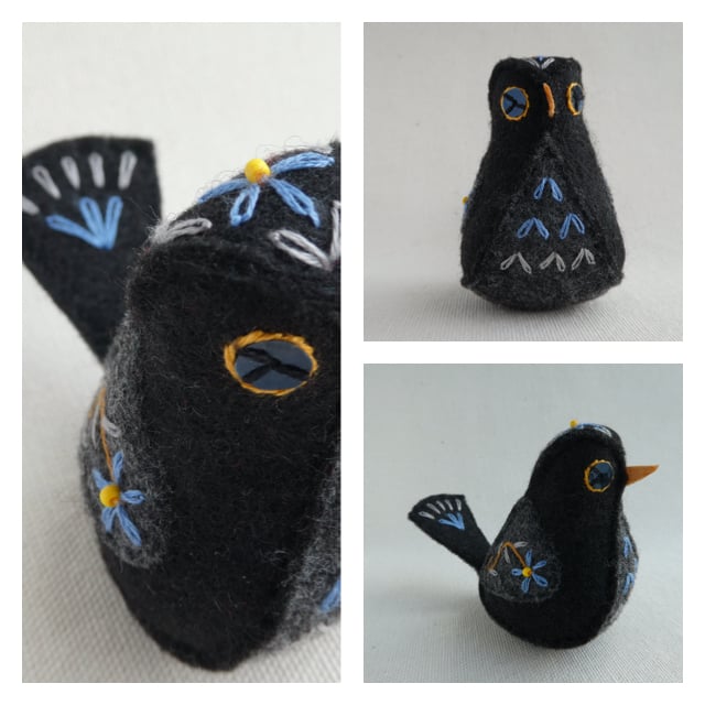 Hand stitched felt Blackbird with hand sewn embroidery.