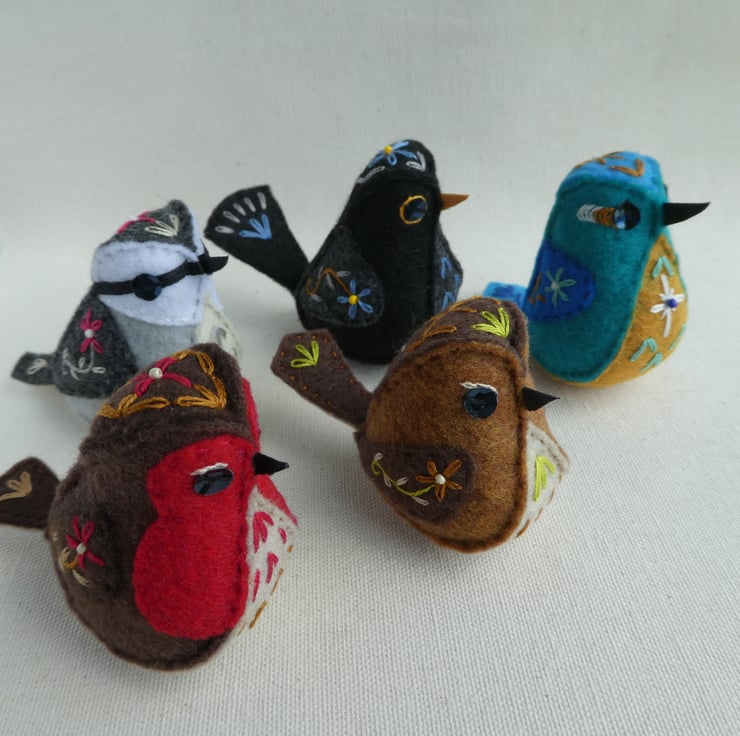 It's made from felt which I've embellished with embroidery and beads, the beak is ribbon stiffened with nail varnish and the bright watchful eyes are sequins. The felt is made from recycled post consumer plastic bottles which makes a lovely soft, strong and fade-resistant material, which I've filled with off-cuts and a few 1p coins for stability.