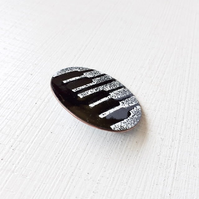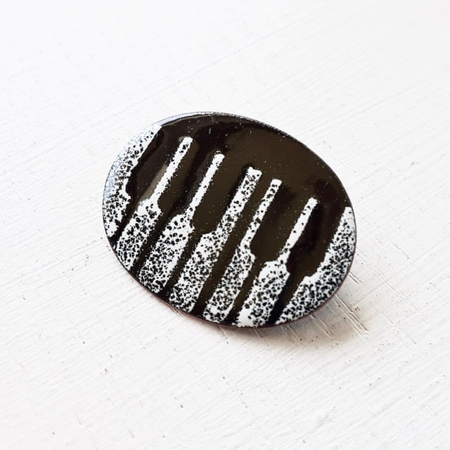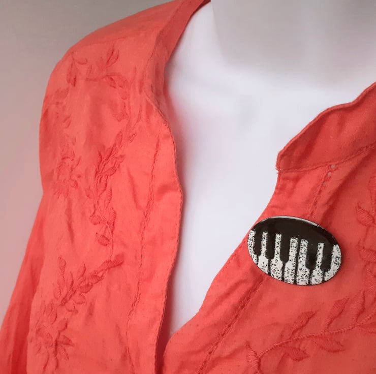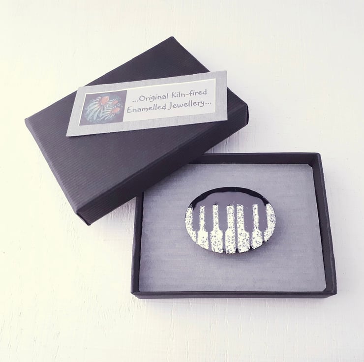 My Piano Keys Brooch has a simple, strong design. I chose to make it in an oval shape cut from recycled copper, as I felt this would emphasise the bold piano keys/keyboard. It is enamelled in black and white in a process which involves building up several layers on both sides with firings in between. The keys design is applied as the final layer. The brooch measures approximately 40mm x 30mm and has a silver-plated brooch pin attached. The enamel on the reverse is a mixed colour and gives strength and durability to the brooch. It is presented in a quality card gift box and will be sent by Royal Mail 'Tracked' postage inside a cardboard packaging box for protection.